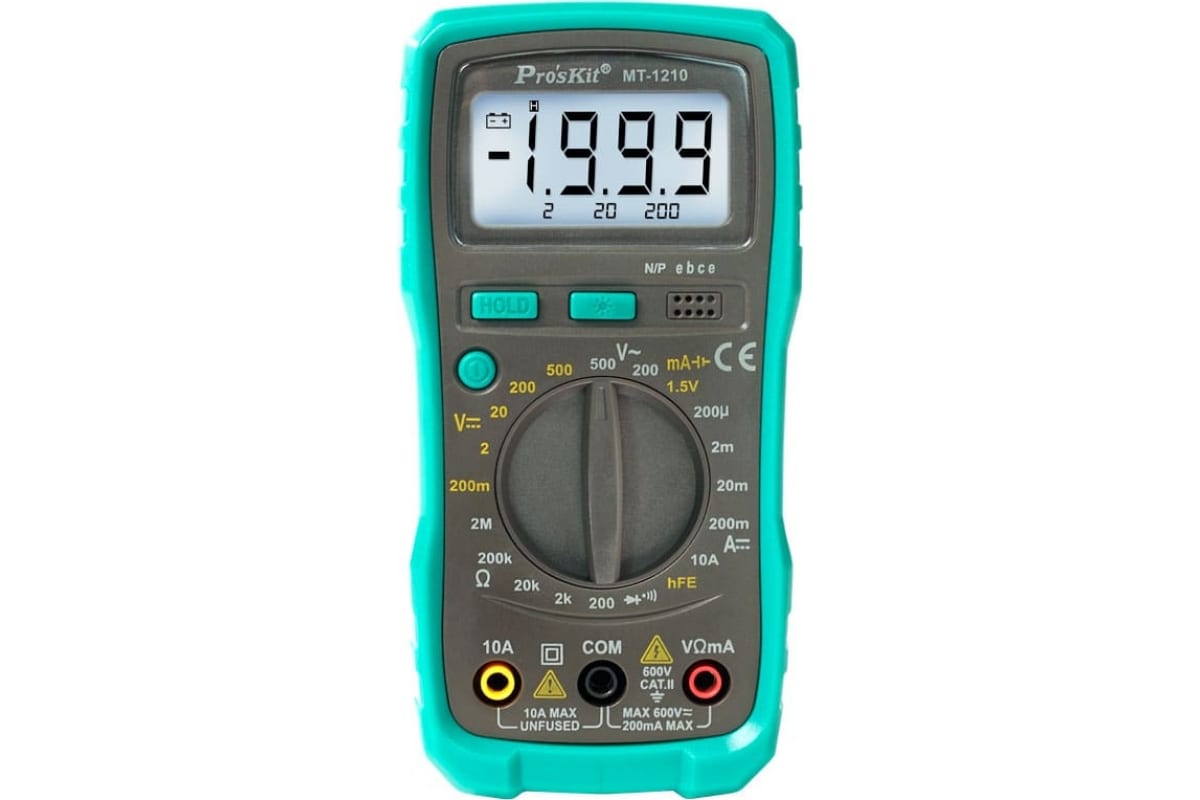 Мультиметр ProsKit MT-1210 00313351 используется для измерения постоянного тока, напряжения, сопротивления. Имеет функции прозвонки цепи, проверки батарей и тестирования диодов.