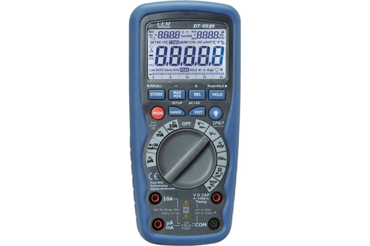 Мультиметр с беспроводным USB интерфейсом СЕМ DT-9939 481103 имеет двойной корпус из пластика для защиты оператора от удара током, а так же самого прибора от промокания (соответствует стандарту IP67). Внутренняя память модель вмещает до 9999 значений. Подсвечиваемый дисплей гарантирует простое и комфортное считывание результатов измерений.