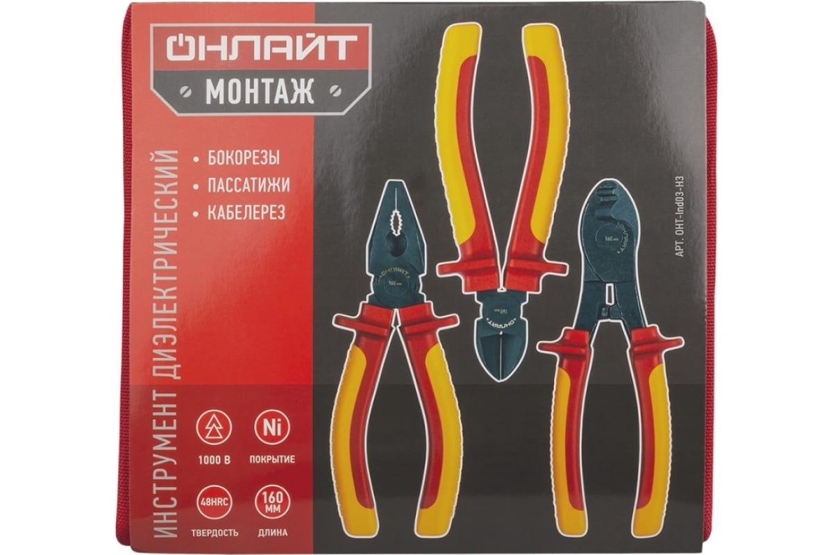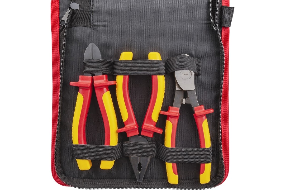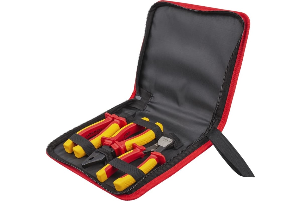 Набор шарнирно-губцевого диэлектрического инструмента предназначен для выполнения широкого спектра электро- и радиомонтажных, электротехнических и других работ с напряжением до 1000 В, включающих резку стальной, медной и алюминиевой проволоки, удержание мелких деталей в электроустановках, выгибание проволочных петель, создание соединительных колец, пинов и др. Рукоятки изготовлены из двухслойной диэлектрической пластизоли методом погружения. Специальные упоры надежно защищают от поражения электрическим током.