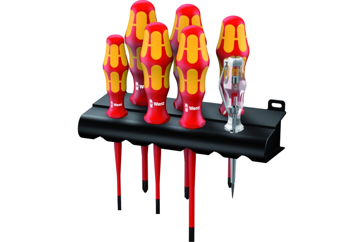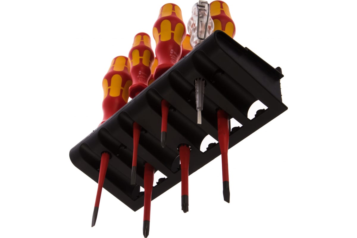 Набор отверток WERA 1000В WE-006480 предназначен для монтажа и демонтажа резьбовых соединений. Инструменты выполнены из инструментальной стали. Для безопасности работы под напряжением до 1000 В предусмотрена изоляция. Для удобства хранения набор поставляется в комплекте с пластиковой подставкой.