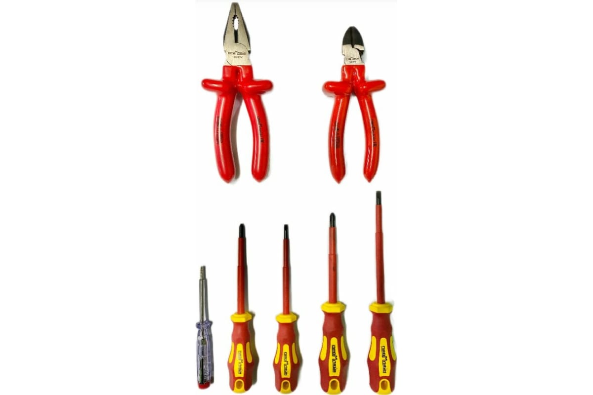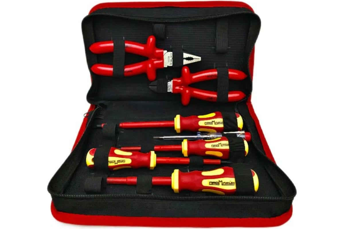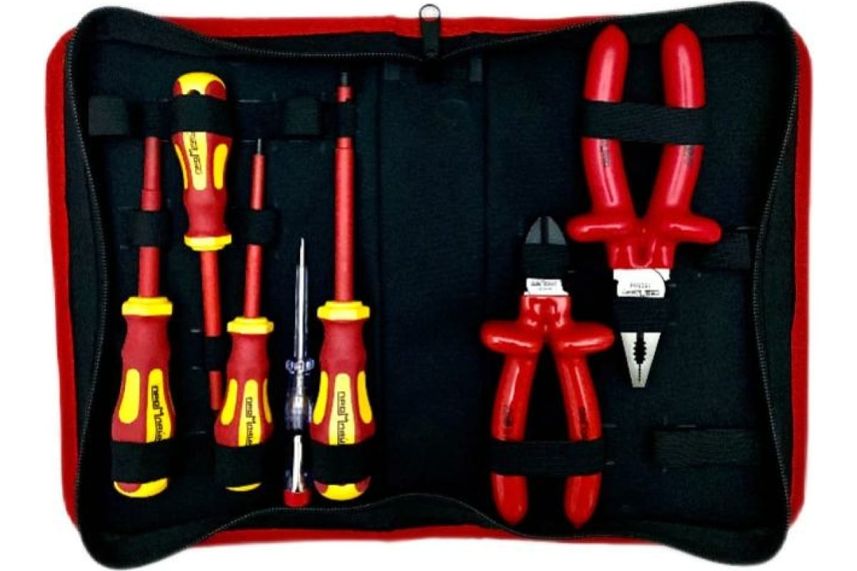 Набор диэлектрического инструмента до 1000В, 7 предметов, в кофре ПЛ071206_z022 предназначен для проведения электромонтажных работ в электроустановках напряжением до 1000 В переменного тока промышленной частоты. Состоит из семи предметов различного назначения: губцевый инструмент, отвертки SL, PH, индикаторная.