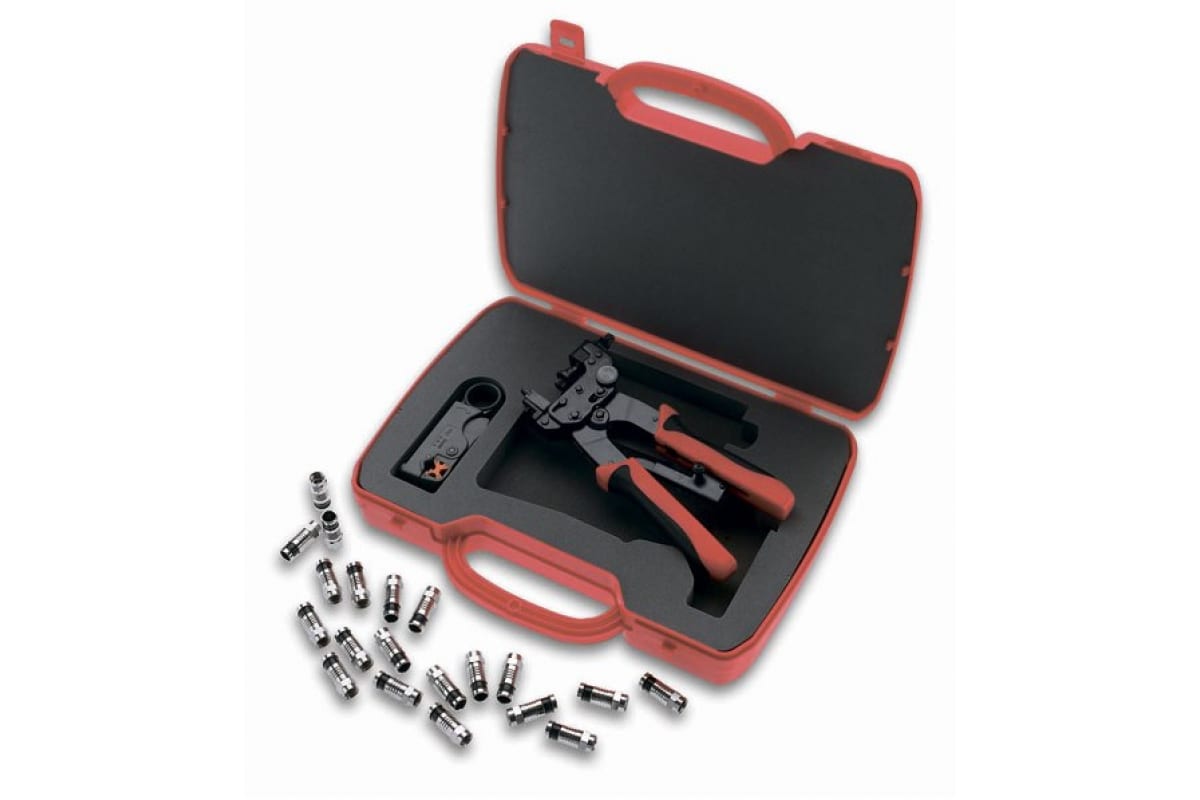 Набор инструмента CIMCO F-Kompressionsstecker 10 6154 включает в себя 20 штекеров и оборудование для зачистки коаксиальных кабелей со сменными лезвиями и регулируемой глубиной среза. Основной инструмент для сжатия штекерных компрессионных соединителей имеет длинные двухкомпонентные ручки для снижения усилия при работе. К обжиму доступны F-, BNC- и RCA-Штекеры. Набор включает в себя 22 предмета и кейс из пластика. Общий вес составляет 1200 граммов, что не создает неудобств при транспортировке.