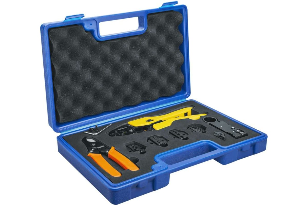 Набор включает пять самых востребованных сменных матриц с овальными, трапециевидными, лепестковыми и клиновидными профилями обжима, а также ножницы и съемник изоляции для коаксиального кабеля.