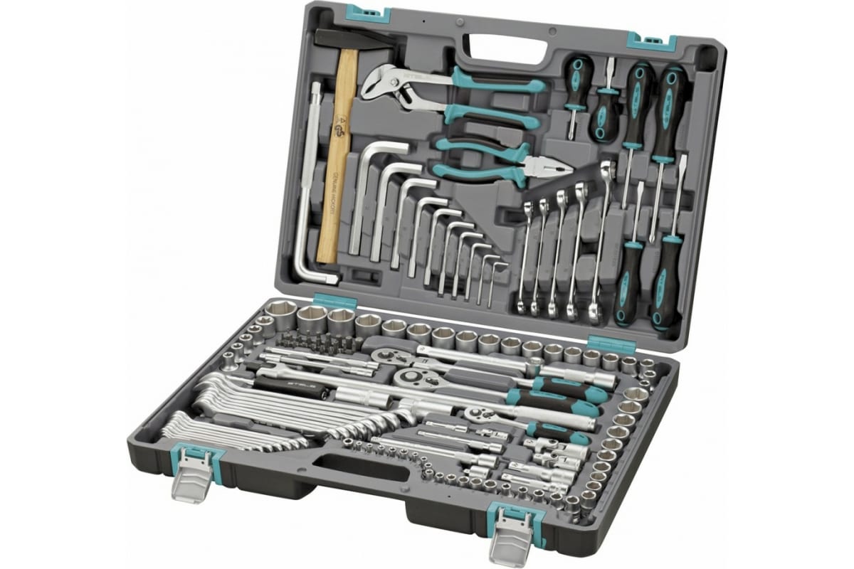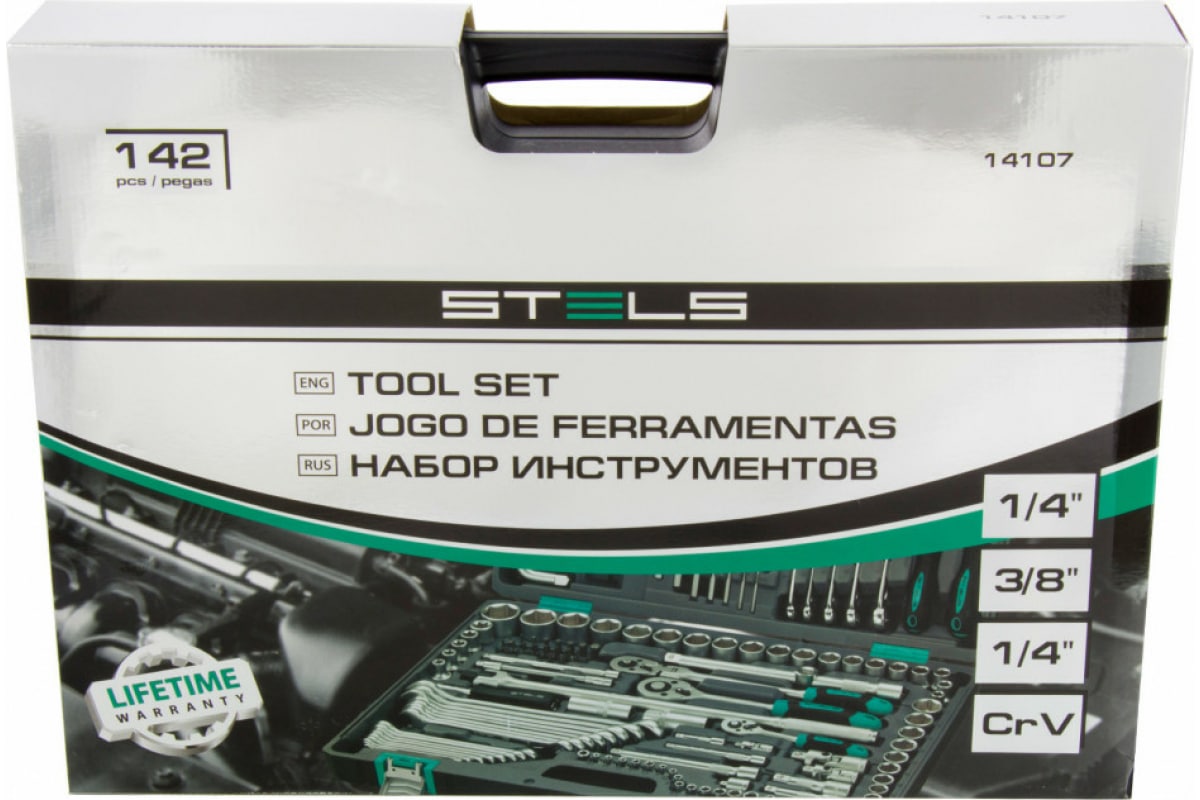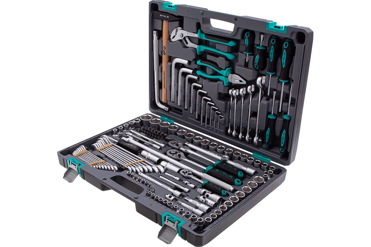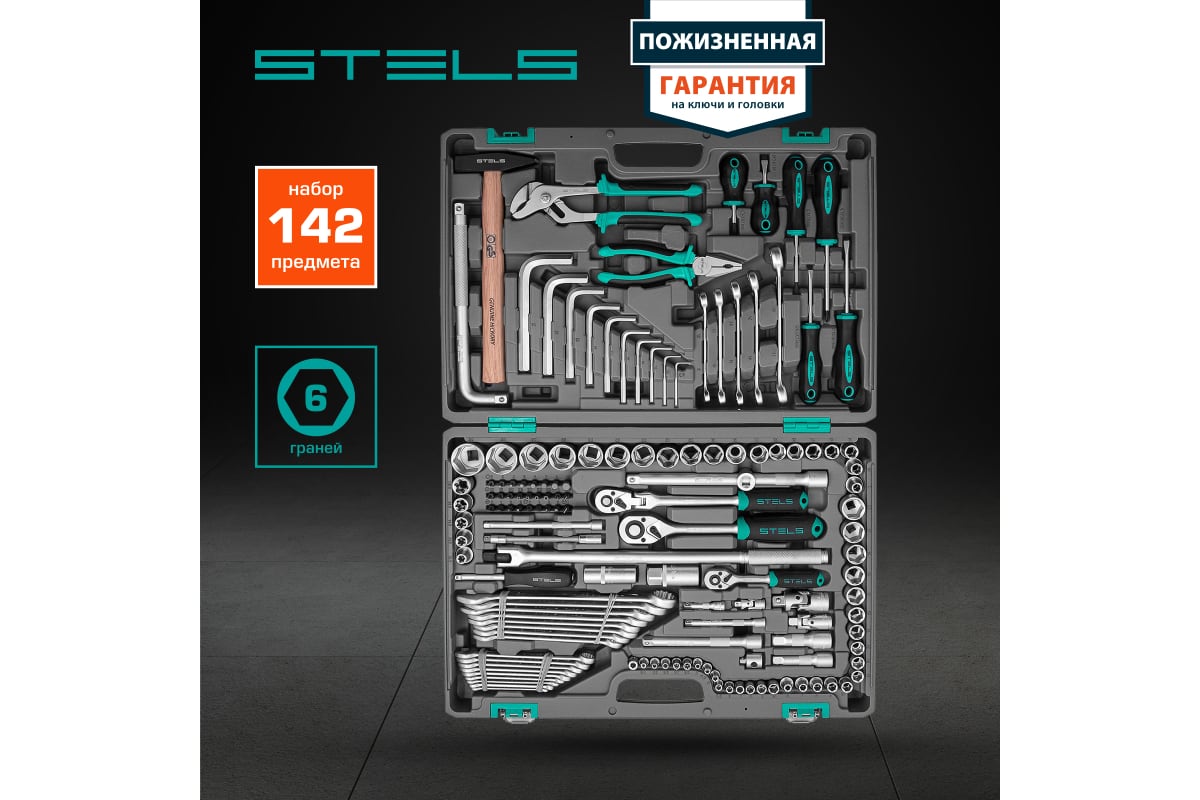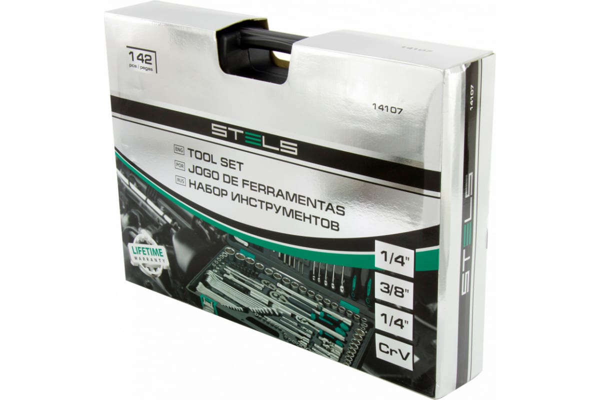 Набор инструментов 142 шт STELS 14107 включает в себя широкий ассортимент ручных приспособлений для эффективной работы в условиях станций технического обслуживания автомобилей.
