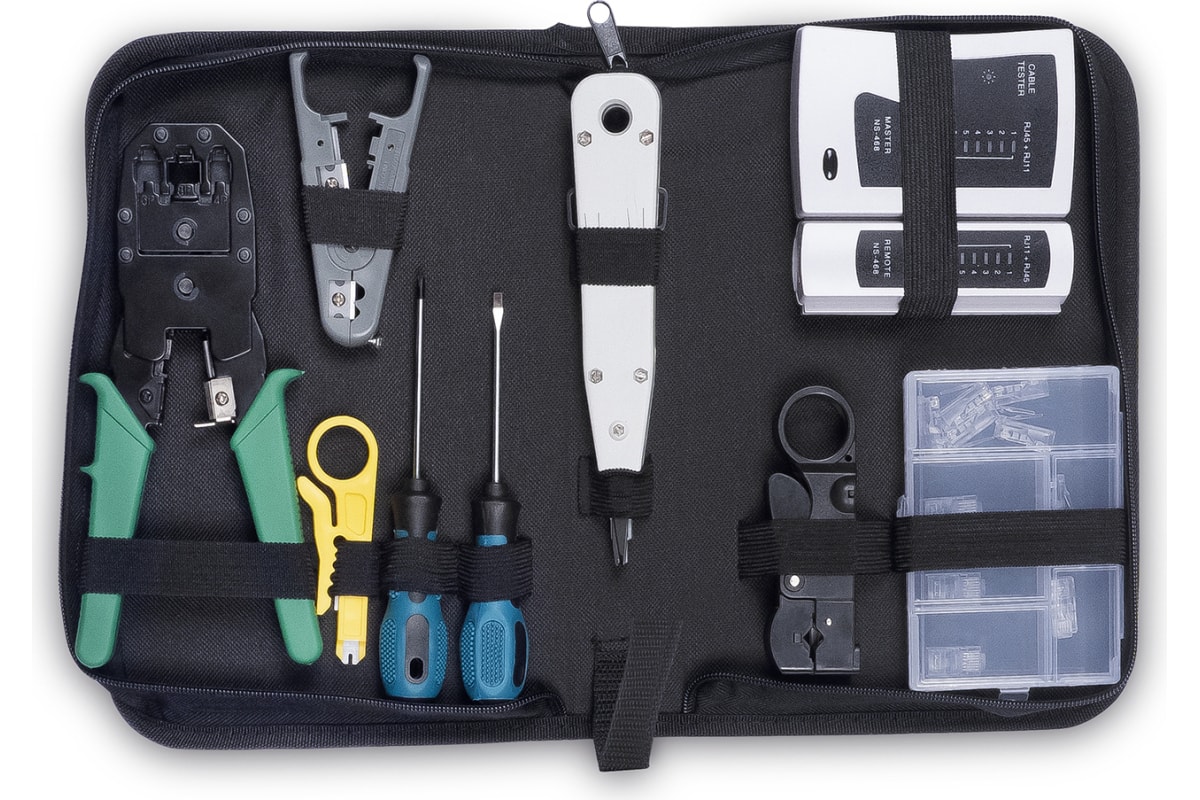 Инструменты, входящие в набор, позволяют производить операции по обрезке и зачистке кабелей витой пары, разделке их на IDC-контактах патч-панелей и кейстоунов, заделке проводников на телефонных плинтах Krone, а также обжим коннекторов RJ-11/12 и RJ-45.