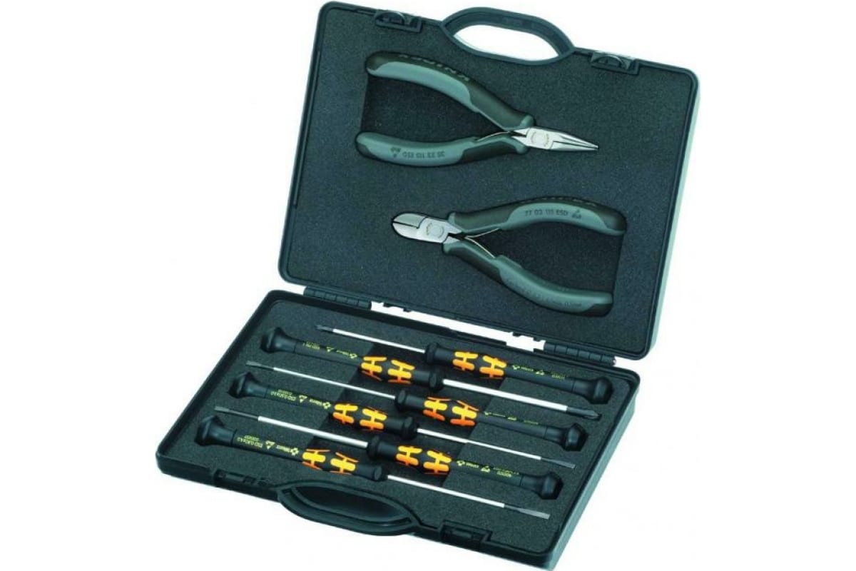 Набор инструментов для электроники KNIPEX KN-002018ESD включает 8 предметов с функцией снятия электростатического напряжения. Используется для выполнения самых тонких электромонтажных работ. Благодаря тому, что головки плоскогубцев тщательно отполированы и закалены в масле, а отвертки имеют никелированное покрытие, обеспечивается надежная защита от коррозии. Многокомпонентные рукоятки удобно лежат в руке и препятствуют скольжению.