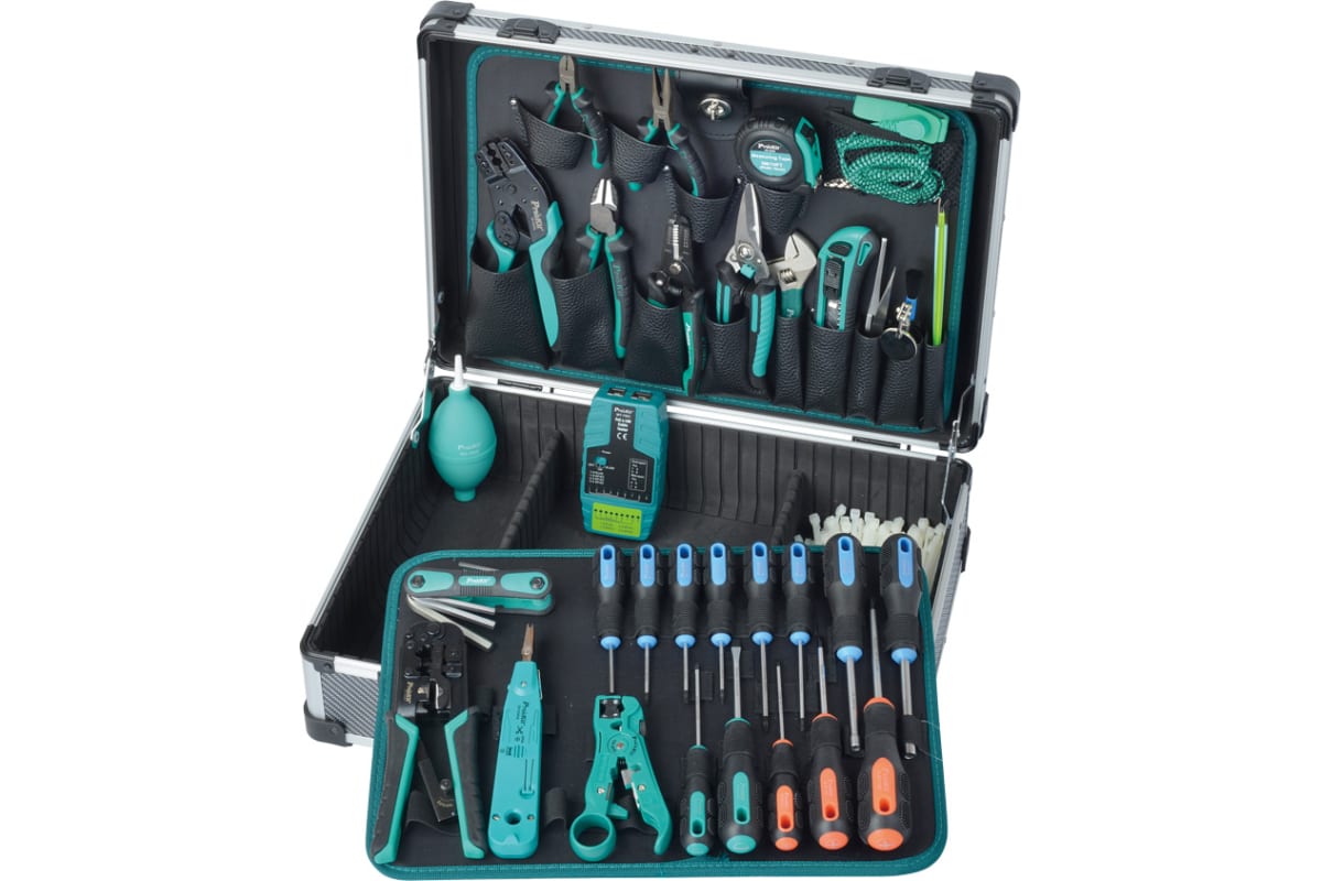 Набор инструментов для обслуживания ProsKit LAN PK-1938M1 (аналог 1PK-19382B) С00040174 представляет собой профессиональный набор инструментов для телекоммуникаций и сетей с кабельным тестером в комплекте. Используется для установки и обслуживания компьютерной и сетевой систем. Предназначен как для бытового использования, так и для профессионального.