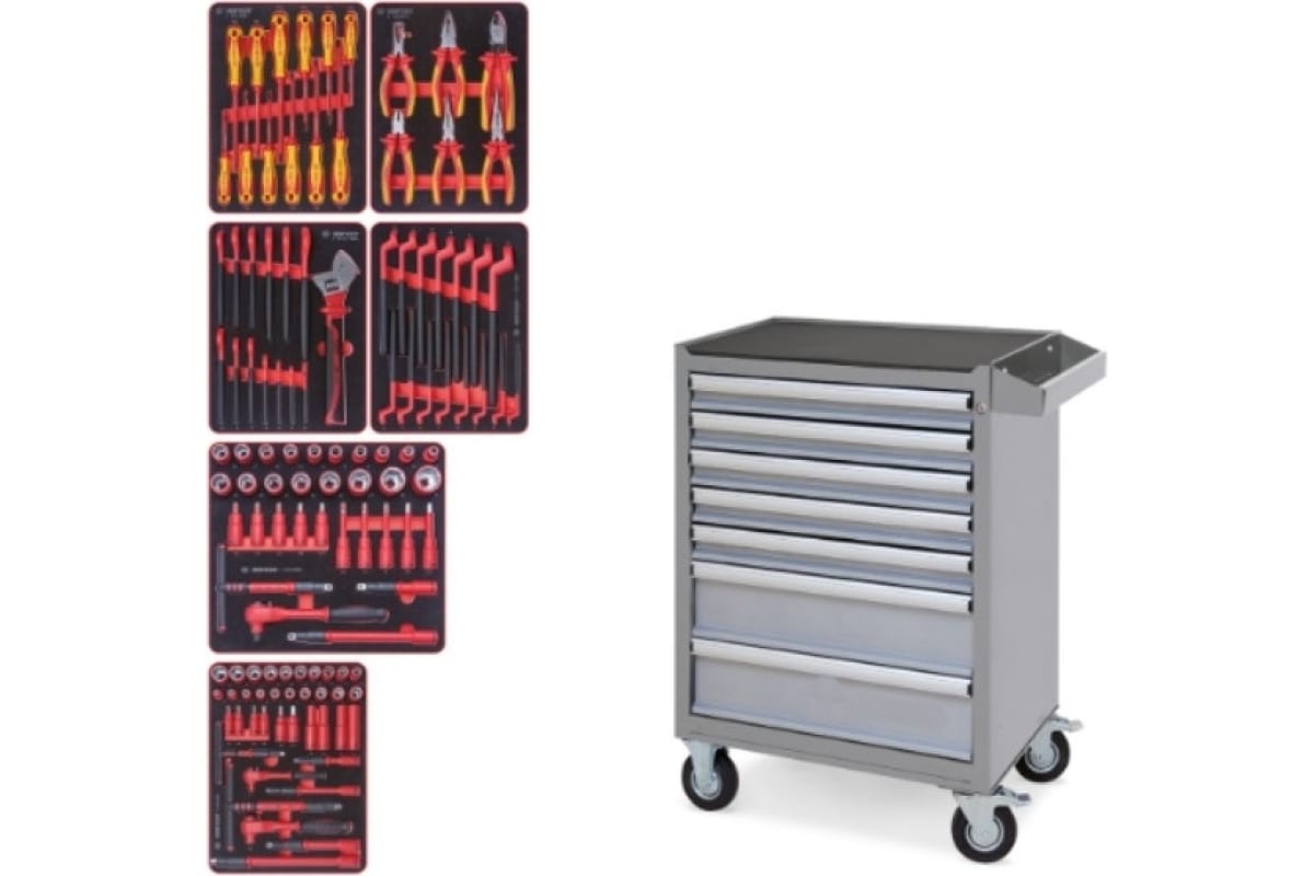 Набор инструментов KING TONY "HIGH VOLTAGE" в серой тележке, 117 предметов 934-117AMGE предназначен для организации рабочего места в любом производственном помещении, станции технического обслуживания или авторемонтной мастерской. Разместив инструмент в тележке по типу, назначению или частоте использования, рабочее место всегда будет в полном порядке.
