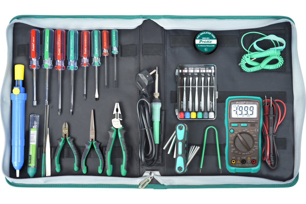 Набор инструментов ProsKit PK-616B (аналог 1PK-616B) С00040189 предназначен для базового технического обслуживания электронных изделий. Отлично подходит для бытового использования. Набор включает в себя мультиметр с подсветкой.