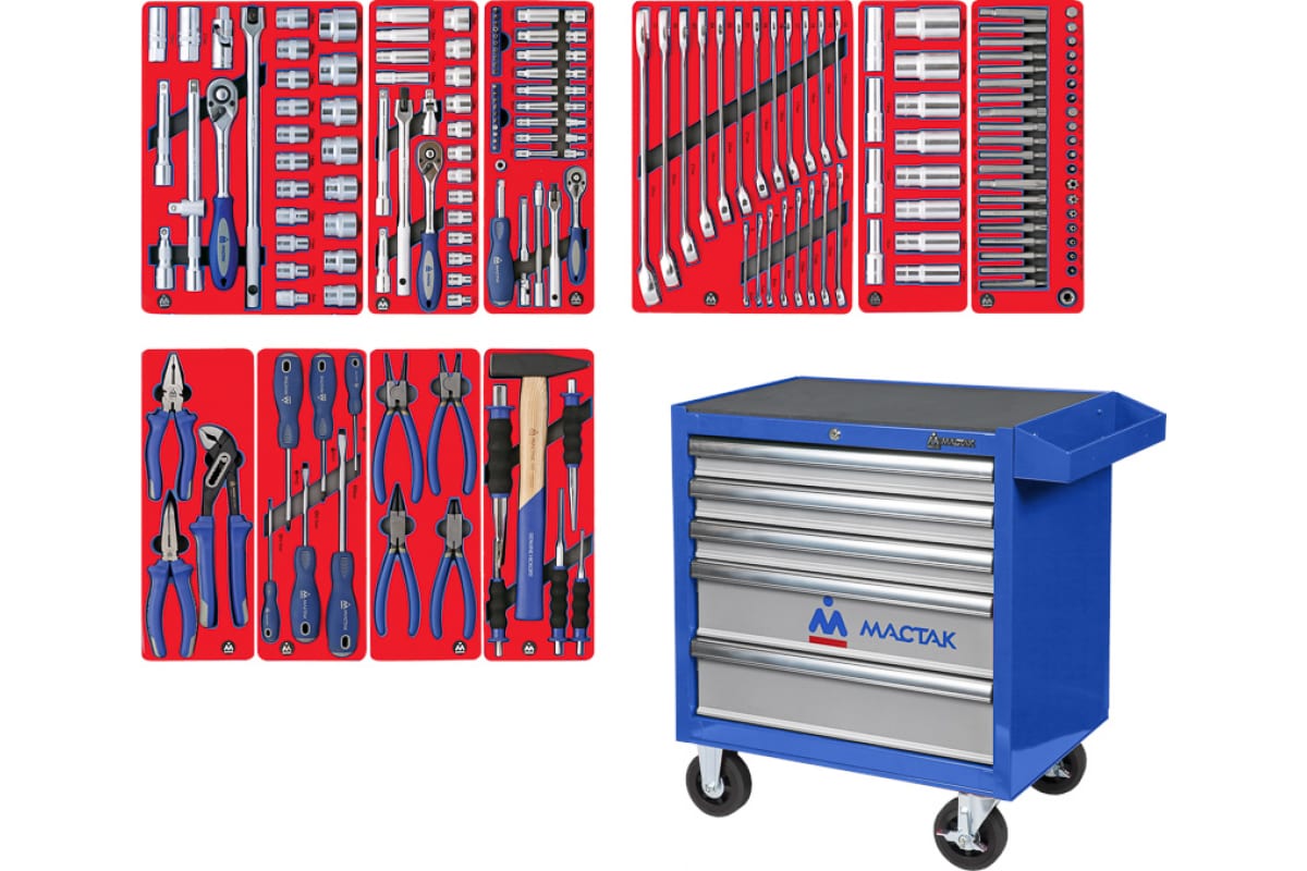 Набор инструментов СТАНДАРТ в синей тележке, 186 предметов МАСТАК 52-186B - это универсальные и простые в эксплуатации ручные приспособления, которыми может пользоваться как опытный, так и начинающий автомеханик. Данный комплект предназначен для ремонта и обслуживания самых различных узлов легковых и грузовых автомобилей. Полки тележки закрываются на ключ, что дает возможность её размещения в проходных местах. Общее количество ложементов - 10.