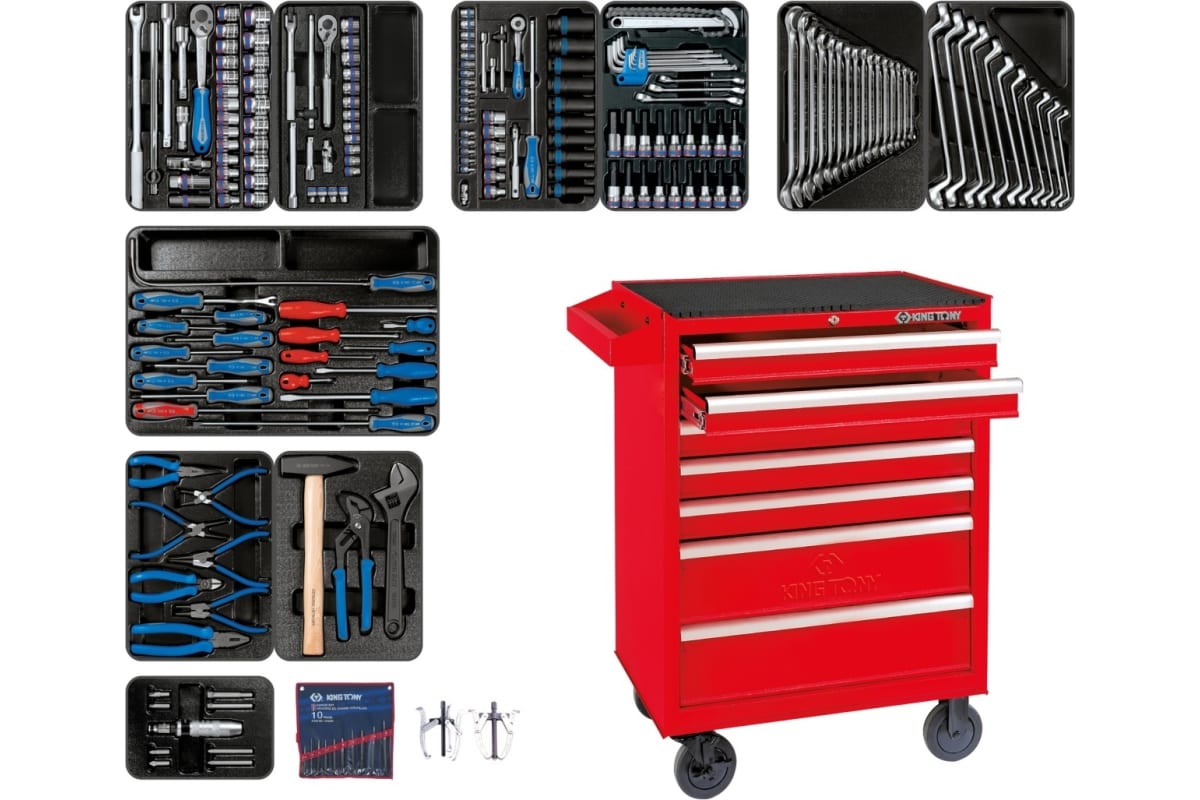 Набор инструментов в красной тележке KING TONY 204 предмета 934-100MR предназначен для профессионального использования в автосервисной мастерской, на станции технического обслуживания, а также на производстве.