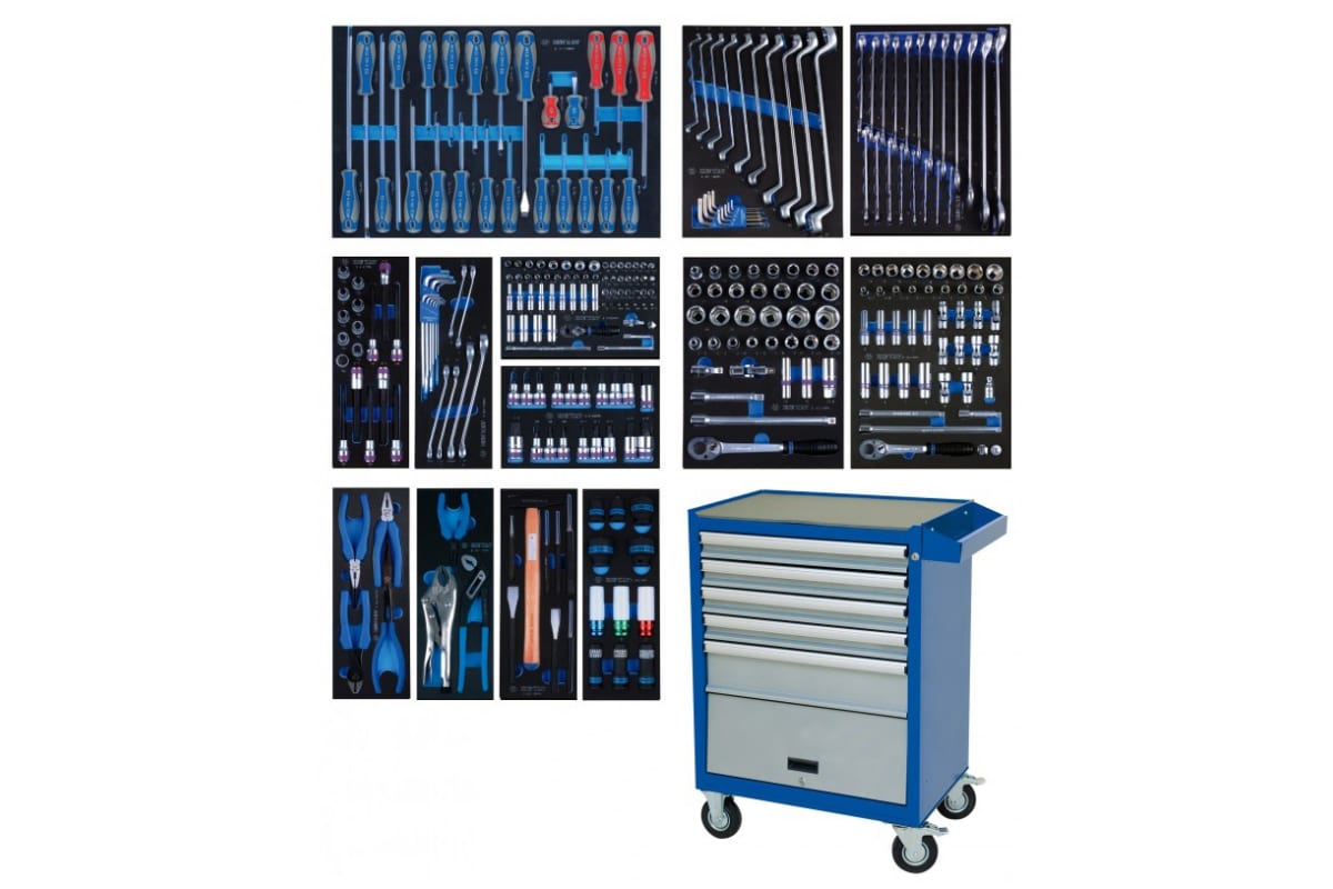 Набор инструментов в синей тележке, 286 предметов KING TONY 934-010AMB включает в себя 286 предметов в 13 ложементах. Предметы в наборе выполнены из прочной хром-ванадиевой стали. Инструмент относится к категории профессиональных и предназначен для использования в автомастерских, на станциях технического обслуживания и на производстве.