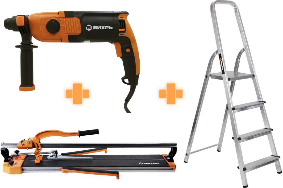 Набор инструментов Вихрь: перфоратор + стремянка + плиткорез 902/10 подойдет для бытового использования.