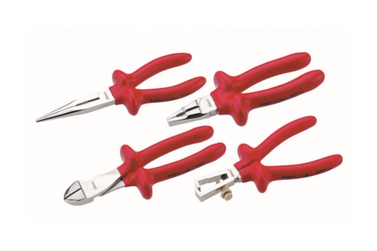 Набор изолированных клещей CIMCO 10 8002 используется электриками. Рукоятки выполнены из двухцветного пластика с многослойной защитой. Если во время работы красный внешний слой рукояток повреждается, то внутренний оранжевый слой становится видимым и сигнализирует об отсутствии 1000В изоляции.