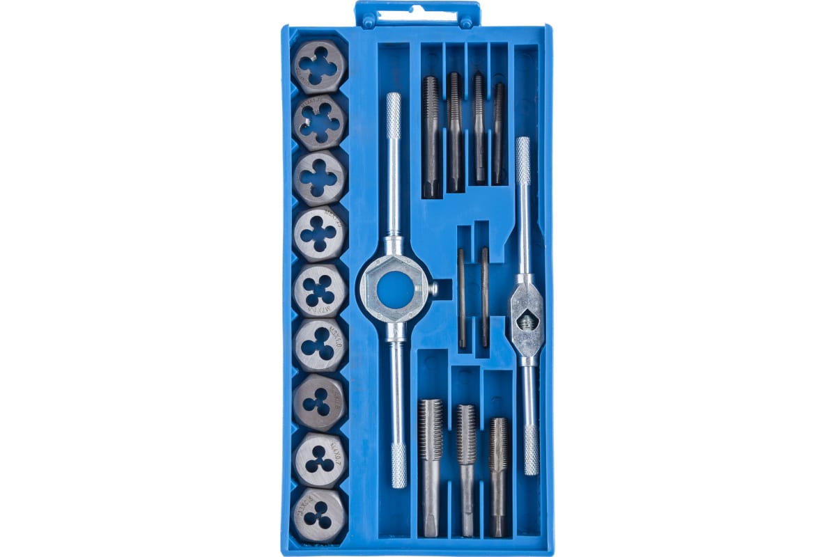 Набор метчиков и плашек 20 предметов AV Steel AV-921130 подойдет для мастерской или небольшого производства.
