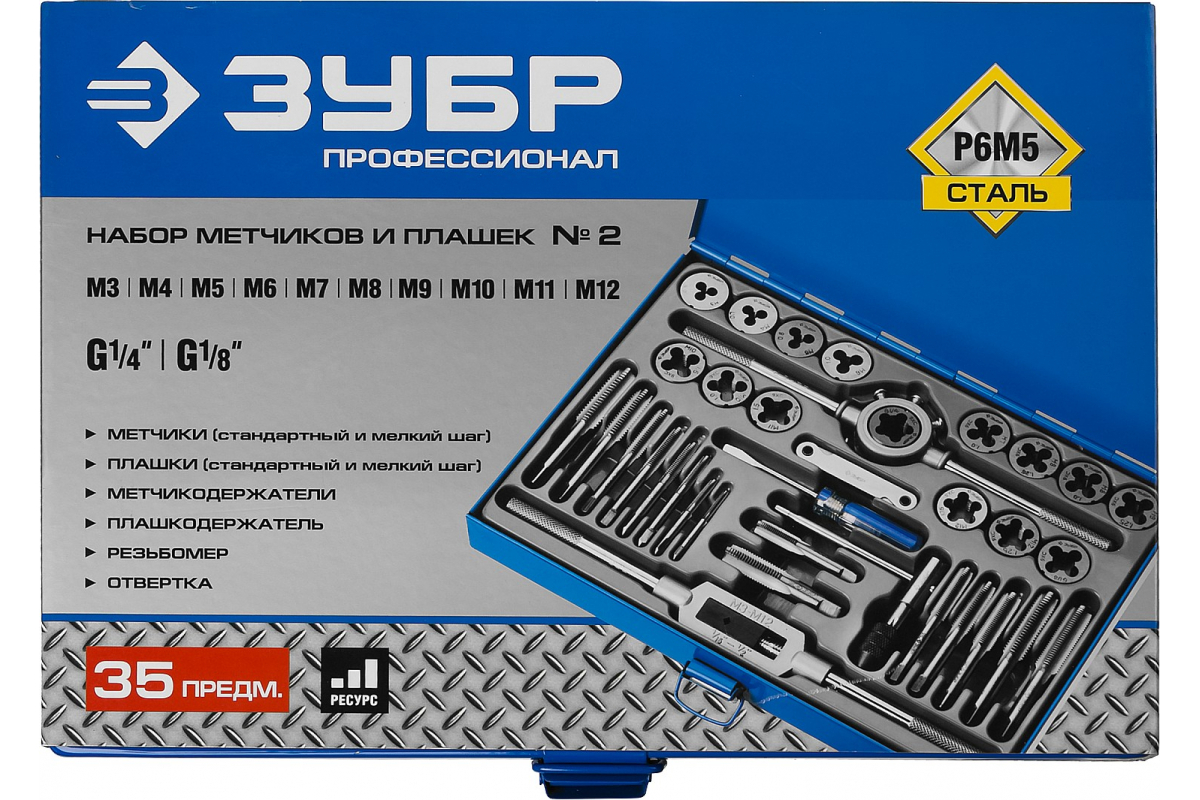 - Зубр ПРОФЕССИОНАЛ сталь Р6М5, 35 предметов 28110-H35 изготовлен из быстрорежущей стали.