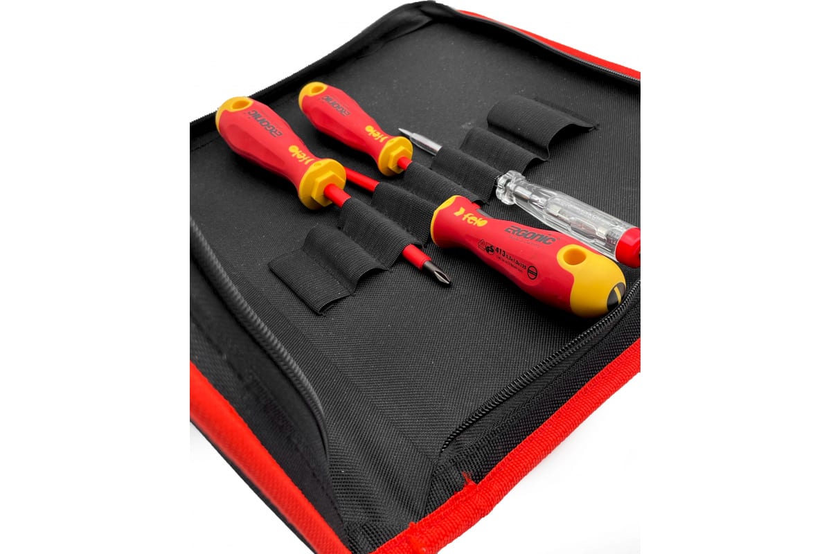 Преимущества набора отверток Felo 41390504- Инструмент безопасности в соответствии с DIN ISO 60900 - все отвертки индивидуально протестированы под напряжением 10 000 вольт