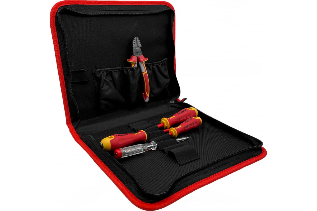 Набор диэлектрических инструментов Felo 41390504 используется для монтажно-демонтажных и ремонтных работ под напряжением до 1000 В. В набор входят диэлектрические отвертки с трехкомпонентной рукояткой Ergonic, диэлектрические бокорезы и отвертка-тестер напряжения сети.