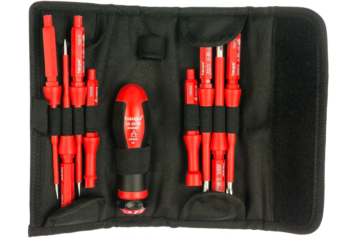 Набор отверток HAUPA Варио PH 102000 включает в себя сменные изолированные стержни и удобную отверточную рукоятку с автоматической блокировкой стержней, которая исключает их случайное выпадение. В систему также включены ключи для распределительных шкафов. Наличие сменного колпачка позволяет использовать отвертку для работы с электроникой. Комплект инструментов станет прекрасным помощником в сфере профессиональных ремонтно-технических работ. Все компоненты удобно хранятся в нейлоновом футляре, дополненном петлей для поясного ремня и застежкой-липучкой.