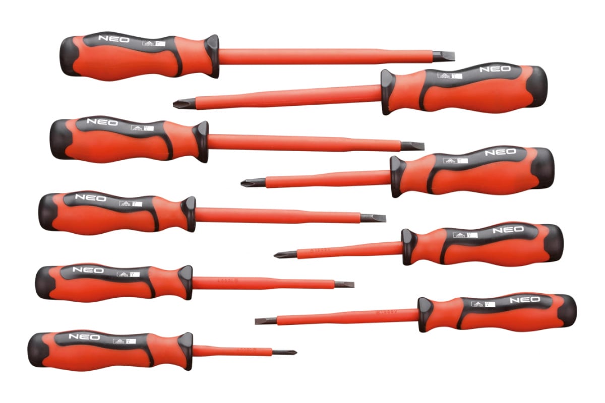 - Плотная изоляция инструментов из набора отверток NEO 1000 В, 9 шт. 04-261 - работа под напряжением до 1000 В;