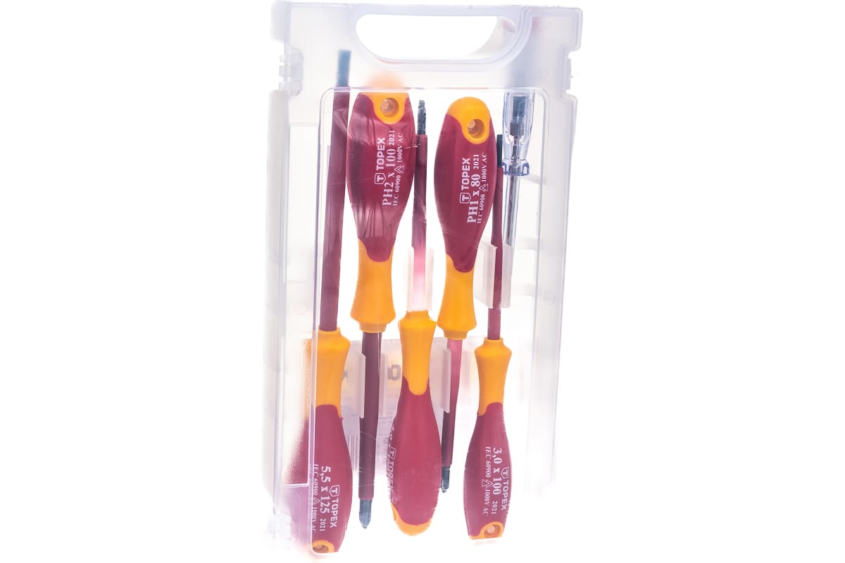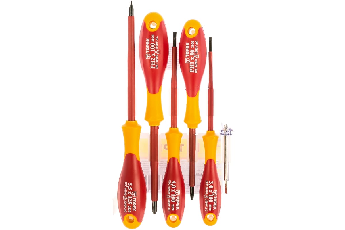 Набор отверток TOPEX 6 шт. 39D150 используется для работы под напряжением до 1000 В. Отвертки изготовлены из прочной высококачественной хромомолибденовой стали, что говорит о надежности и долговечности инструментов. Дополнительно в наборе имеется индикатор напряжения 125 - 250 В. Эргономичные пластмассовые рукоятки, покрытые антискользящим материалом, гарантирует комфортную и безопасную работу. Отвертки изолированны.