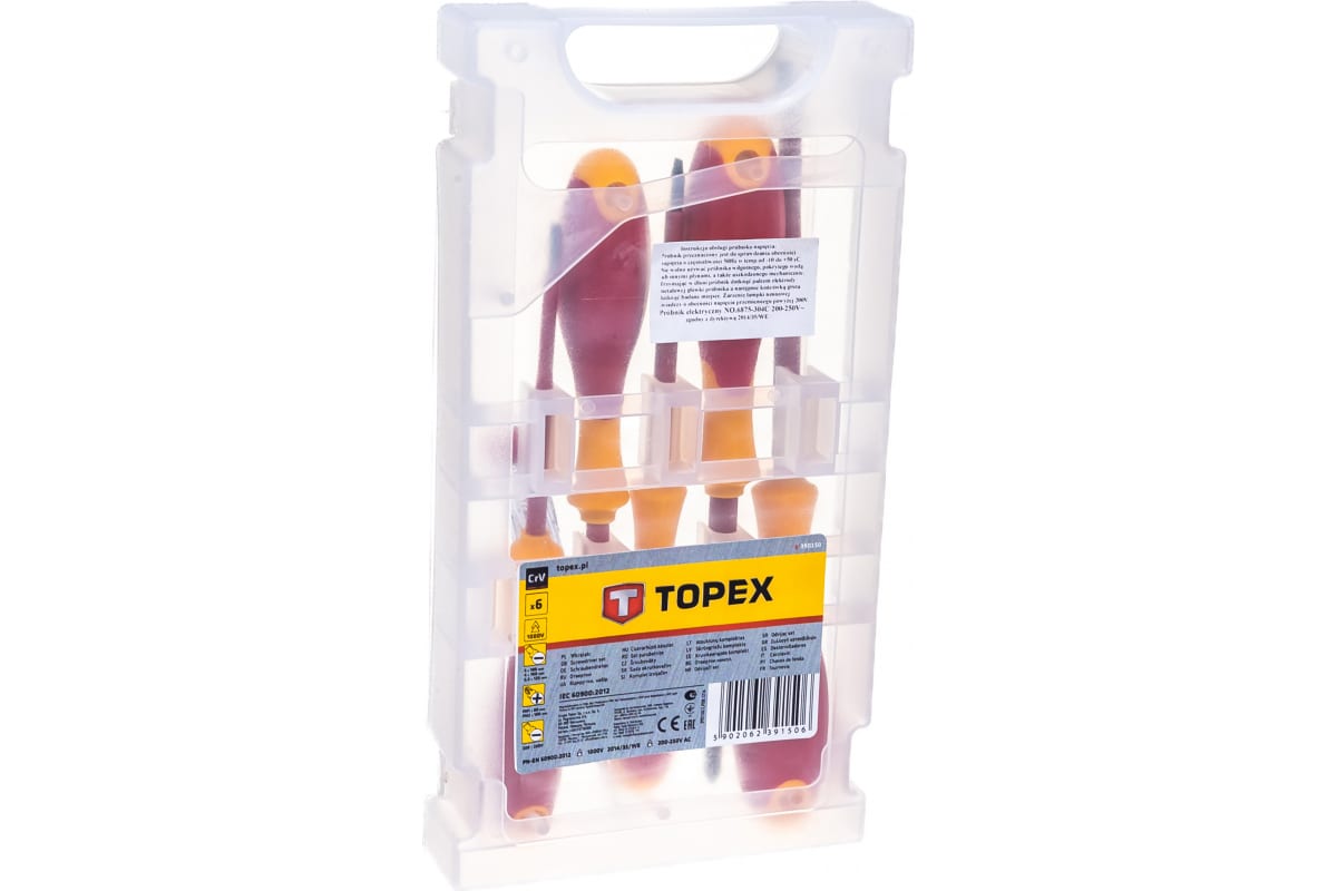Преимущества набора отверток TOPEX 39D150- Отвертки изготовлены из высококачественной хромомолибденовой стали - для надежности и долговечности;