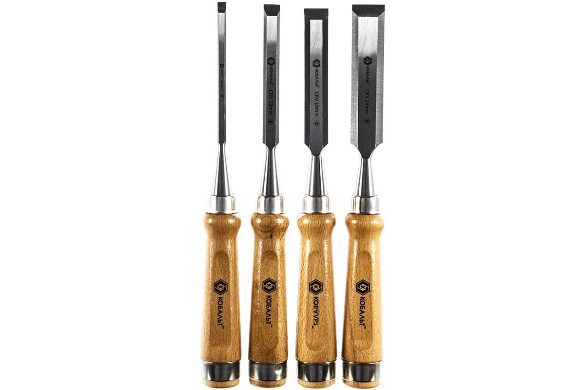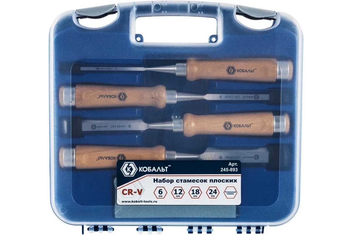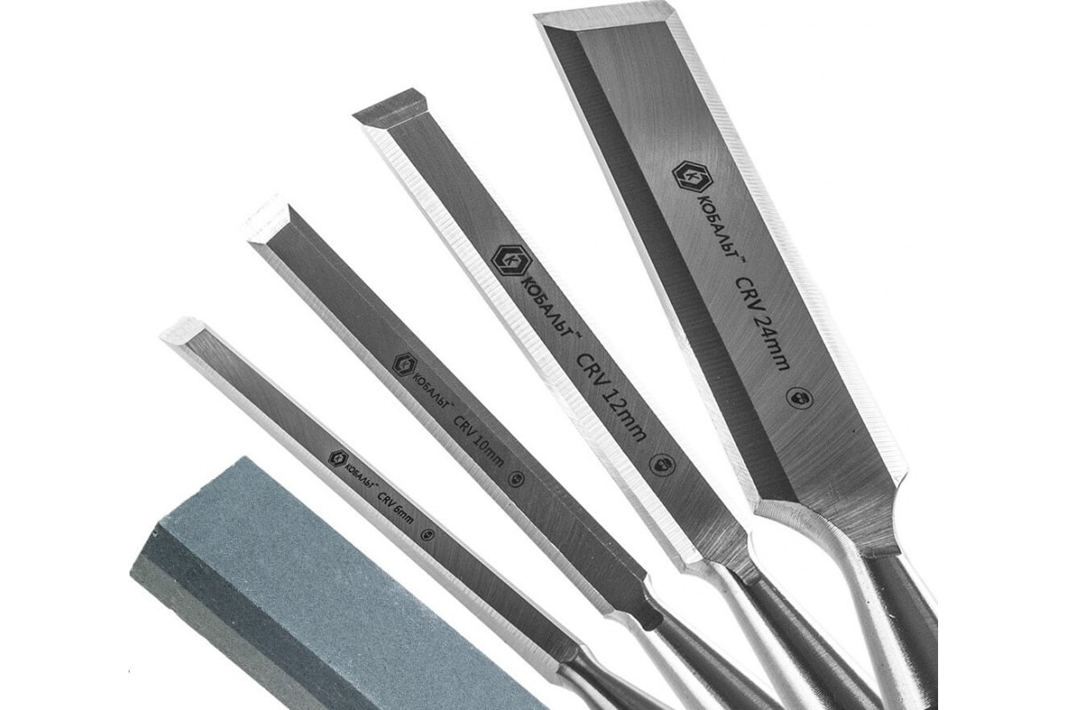 Набор плоских стамесок: 6, 12, 18, 24мм, длина 140мм, CR-V, деревянные рукоятки, точильный камень, 4шт, кейс КОБАЛЬТ 245-893 представляет собой комплект ручных инструментов для выполнения столярных работ. Все компоненты оснащены стальными полотнами с острозаточенной режущей кромкой плоского профиля. Рукоятки стамесок выполнены из древесины и дополнительно защищены металлическими кольцами.