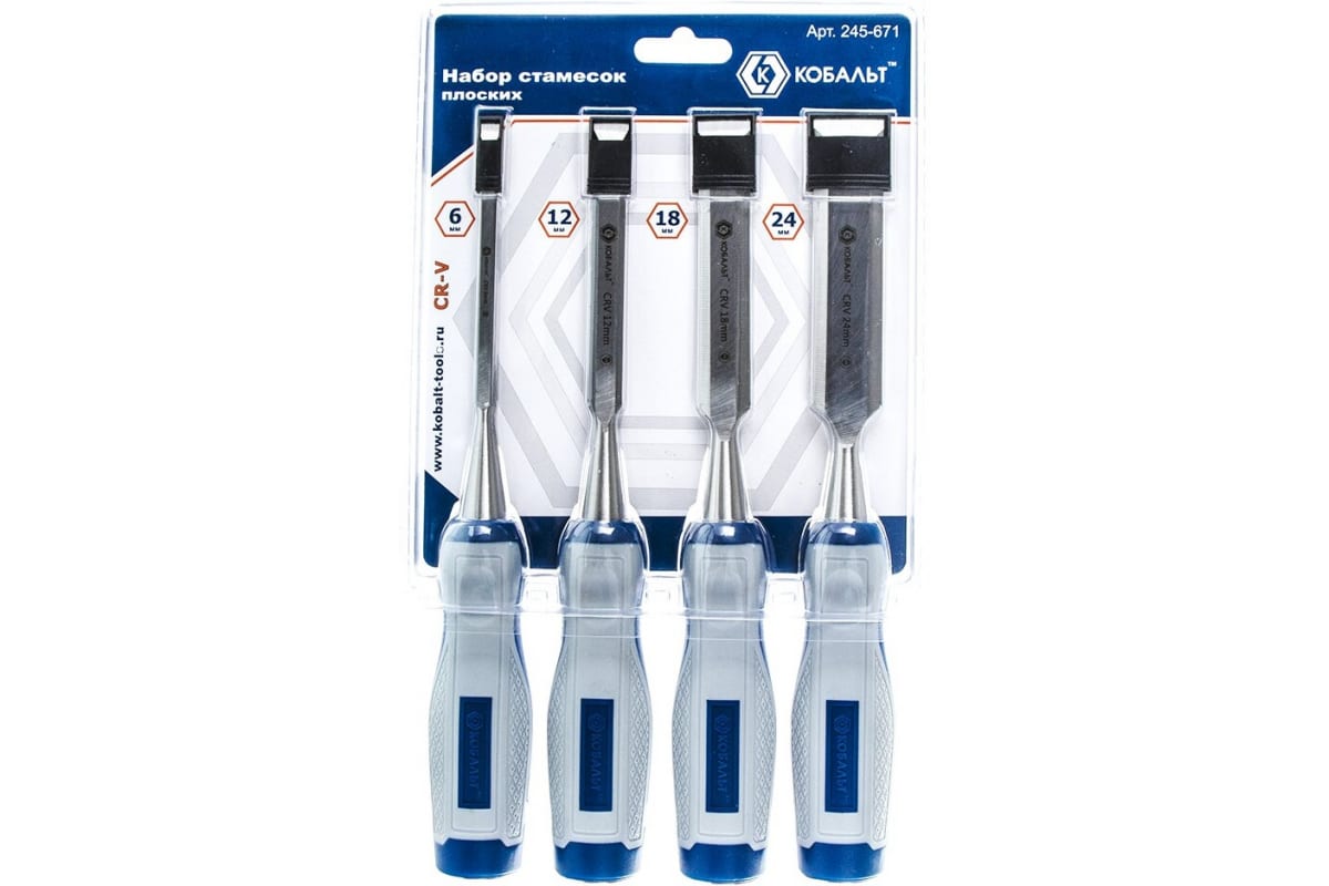 Набор плоских стамесок: 6, 12, 18, 24мм, длина 140мм, CR-V, двухкомпонентные рукоятки, 4шт КОБАЛЬТ 245-671 разработан для точной и качественной обработки заготовок из мягких материалов (древесины, пластика и пр.). В комплекте представлены инструменты самых распространенных размеров. Наличие двухкомпонентных рукояток обеспечивает уверенное удержание без риска проскальзывания в ладони пользователя.
