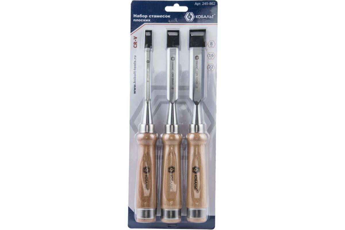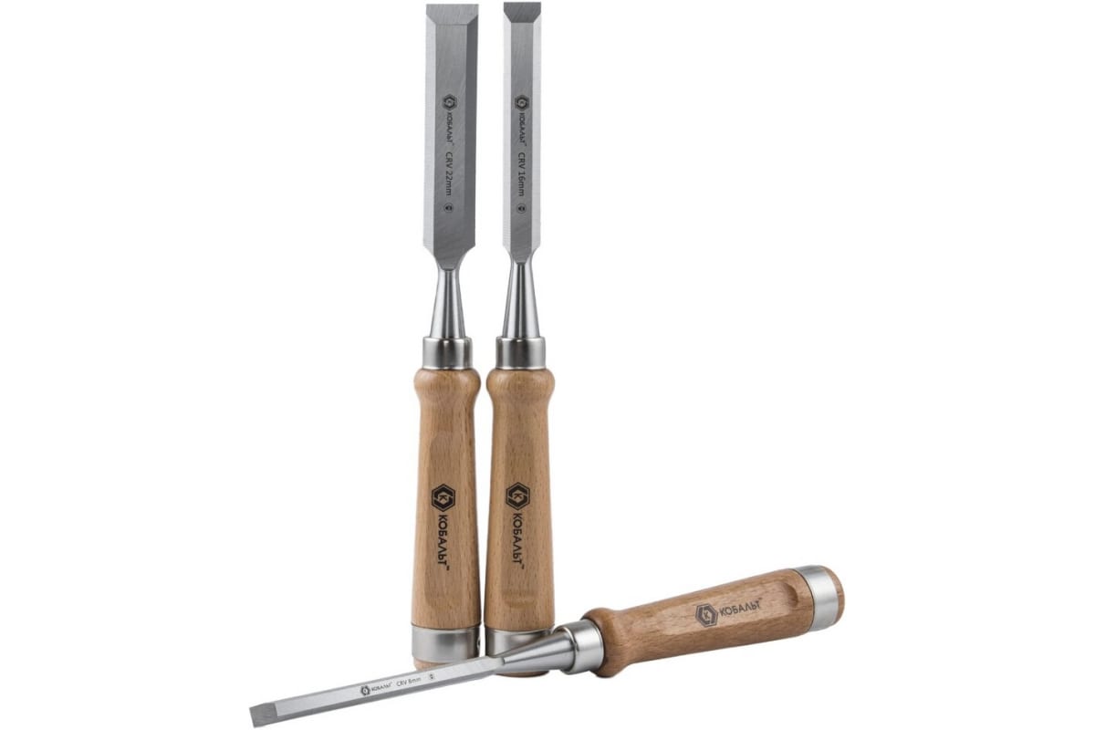 Набор плоских стамесок: 8, 16, 22мм, длина 140мм, CR-V, деревянные рукоятки, 3шт КОБАЛЬТ 245-862 широко распространен для эксплуатации в столярных мастерских. Инструменты имеют различные размеры профилей и позволяют выполнять широкий спектр операций с заготовками из древесины (вытачивания углублений, канавок, фасок и пр.). Специальная форма деревянных ручек обеспечивает удобную работу.