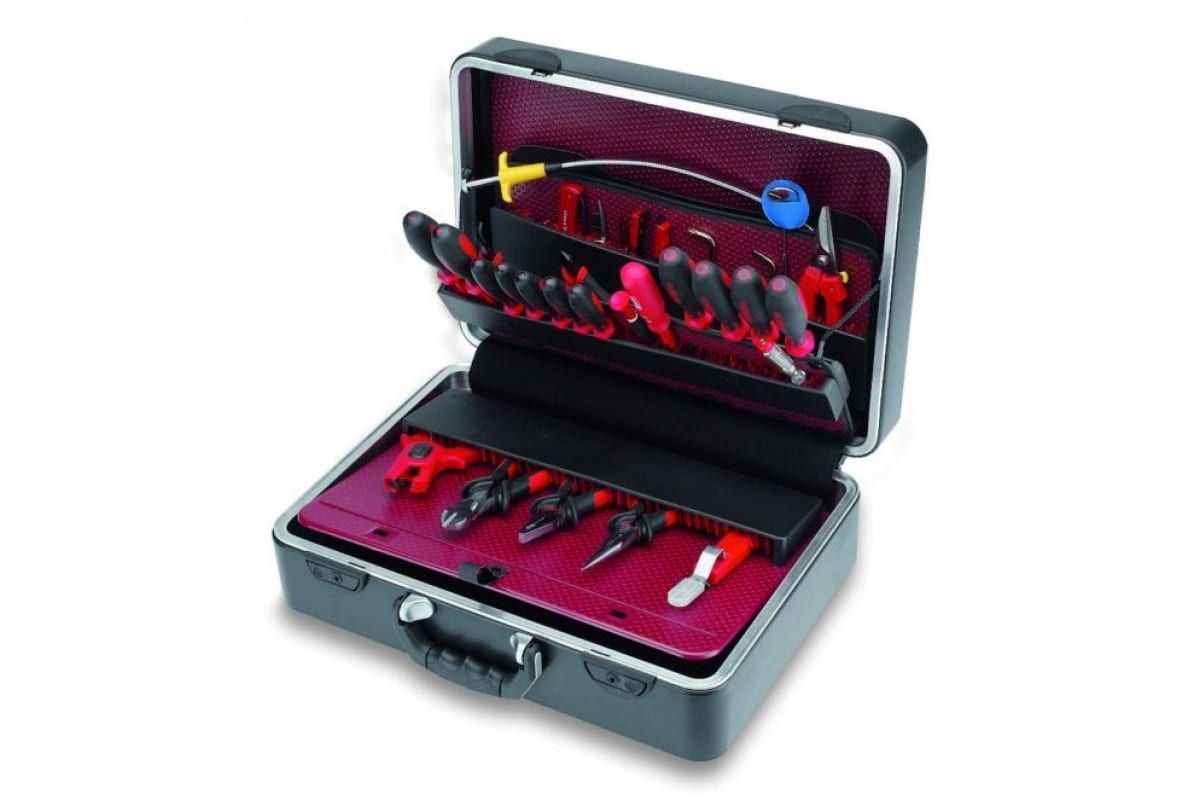 Набор профессионального инструмента CIMCO PERFEKT Elektro-Elektronik 17 5410 оснащен комплектом изолированных прямых и изогнутых отверток, зеркалом для работы в труднодоступных местах, а также гибким захватом. Набор поставляется в удобном и просторном кейсе с несколькими подложками. Металлические петли делают кейс более надежным. Набор предоставляет все необходимое для работ с электрикой: плоскогубцы, бокорезы, нож для снятия изоляции. Удобная рукоятка упрощает транспортировку набора. Вес всего инструмента составляет 7.35 килограмма.