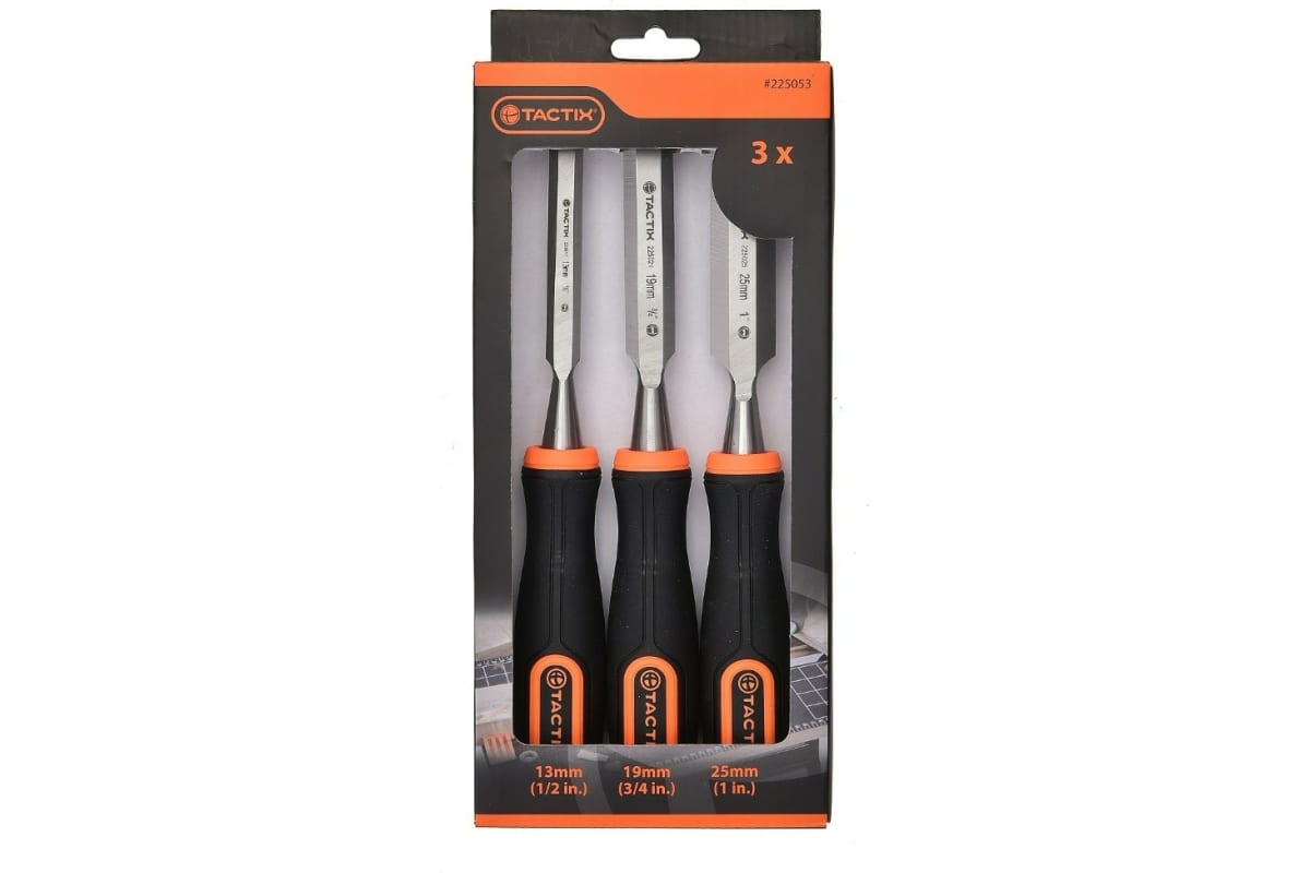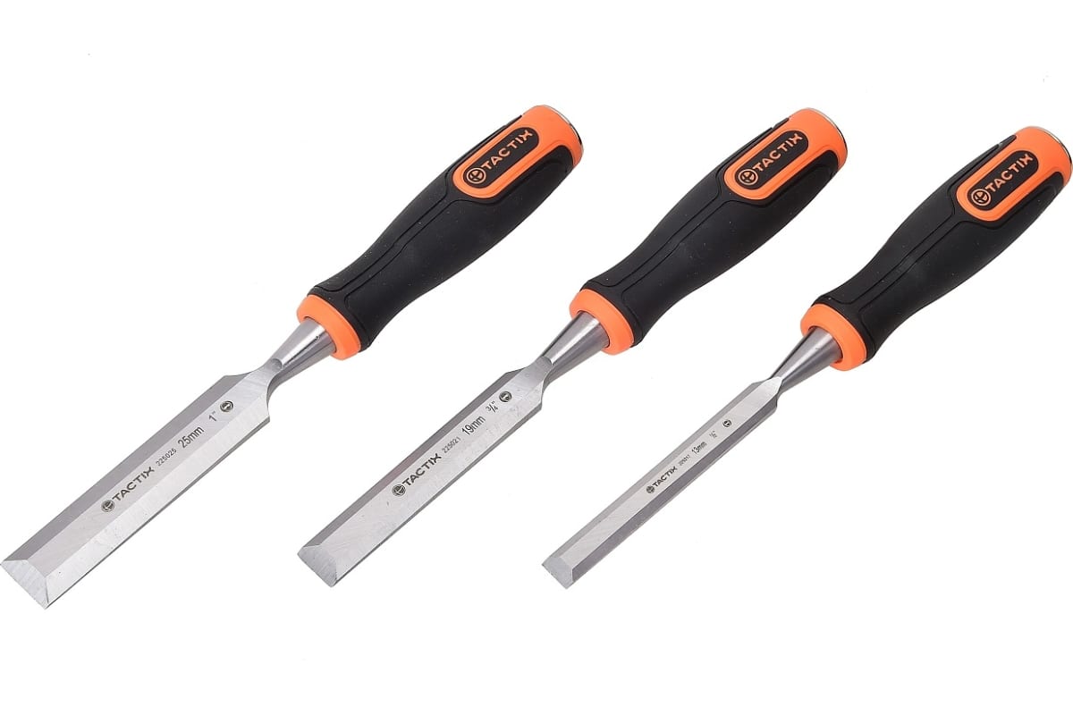 Набор стамесок TACTIX из 3-х штук, 13, 19, 25 мм 225053 используют для выборки небольших углублений в древесине, зачистки пазов, снятия фасок. Усиленные плоские лезвия долговечны и максимально надежные. Лезвия изготовлены из усиленной и закаленной хромованадиевой стали, что обеспечивает долгий срок службы. Двухкомпонентные рукоятки удобно лежат в руке и снижают усталость при работе.