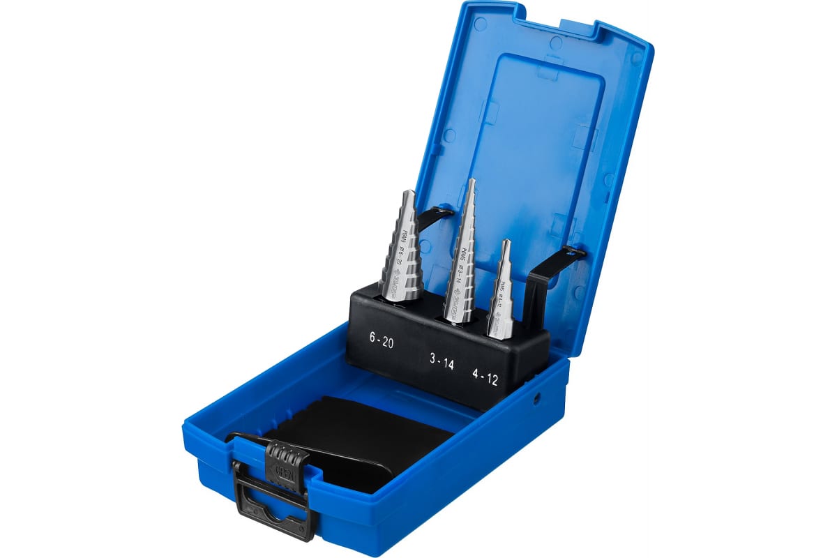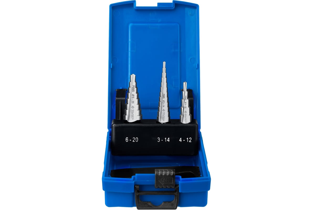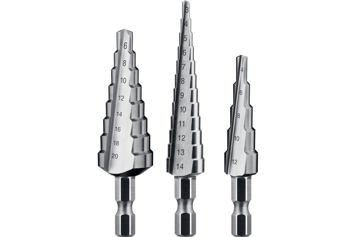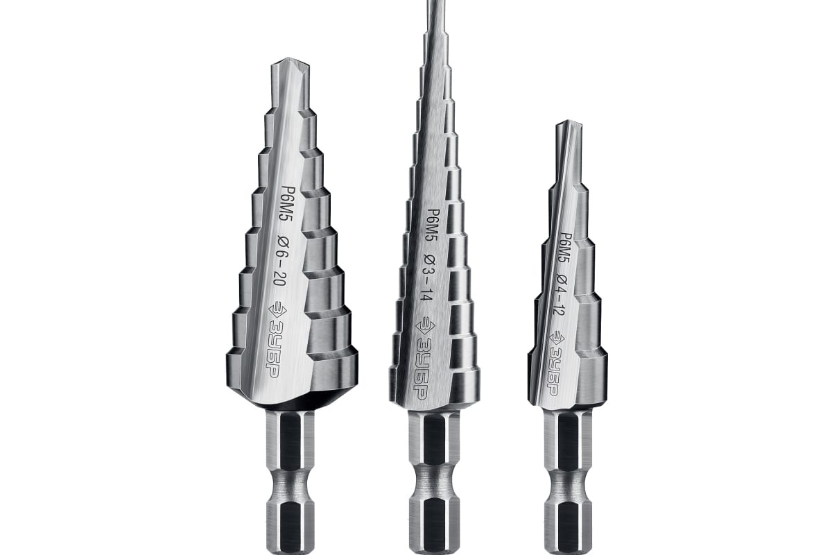 Набор ступенчатых сверл ЗУБР 29670-3-20-H3_z01 применяется для сверления металлических конструкций и заготовок, листовых материалов, цветных металлов, пластика. Допустимая толщина листового металла до 4 мм. Крестообразная подточка позволяет начать сверление без предварительных работ. Угол заточки при вершине, равный 135 градусов, обеспечивает ускорение процесса сверления. В наборе три сверла. Сверла изготовлены из быстрорежущей стали Р6М5.