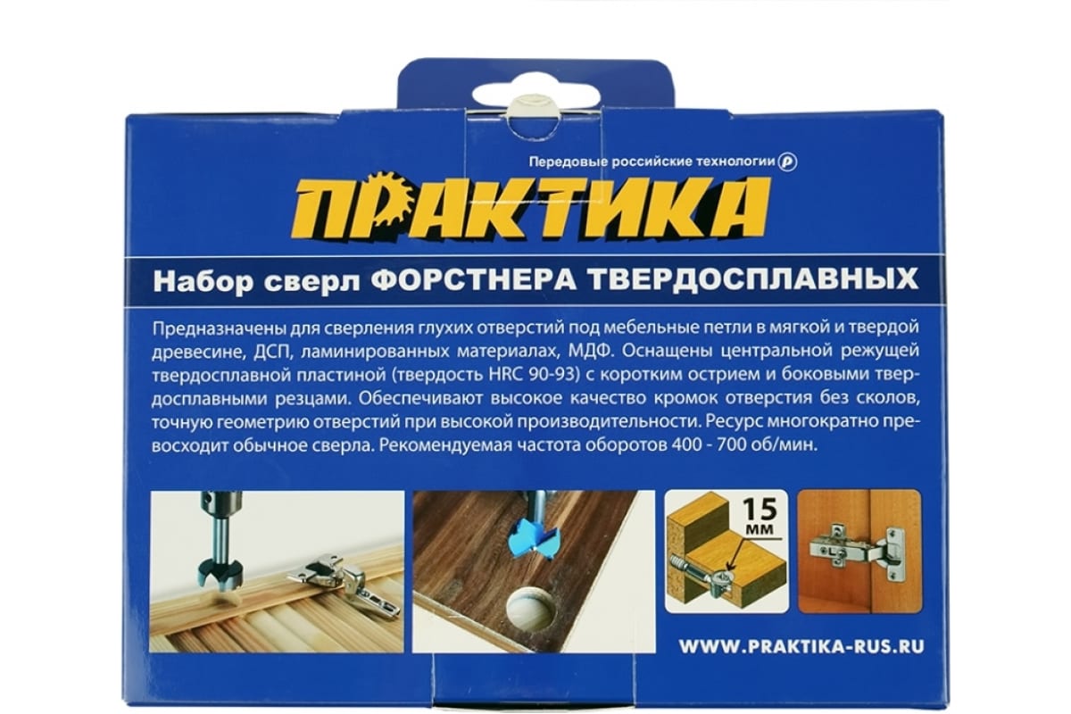 Набор сверл Форстнера твердосплавных ПРАКТИКА 918-641 применяется для сверления отверстий в мягкой и твердой древесине; древесине, покрытой шпоном; ДСП; ламинированном ДСП. Предназначен для точного сверления глухих отверстий. Сверла оснащены боковыми режущими кромками и центрирующим острием. Обеспечивают высокое качество реза без сколов и хороший отвод стружки. В наборе 5 сверл.