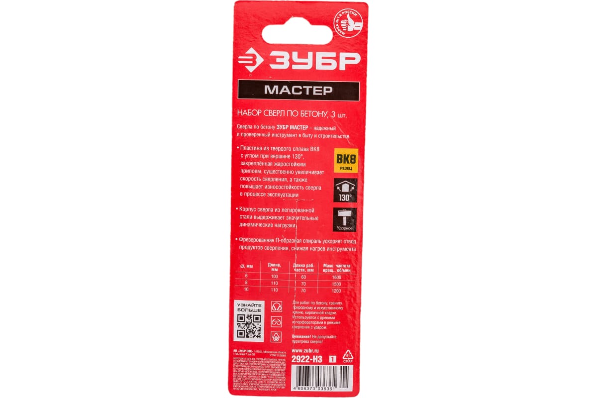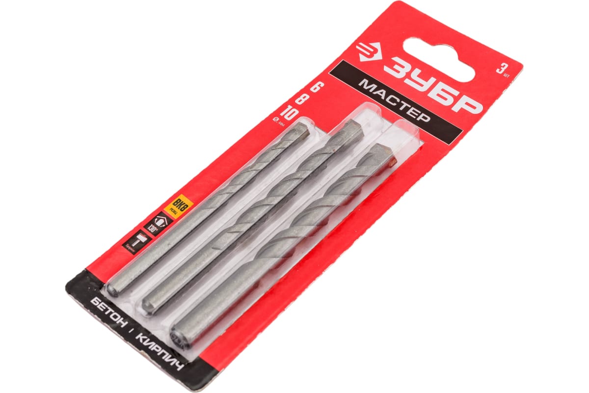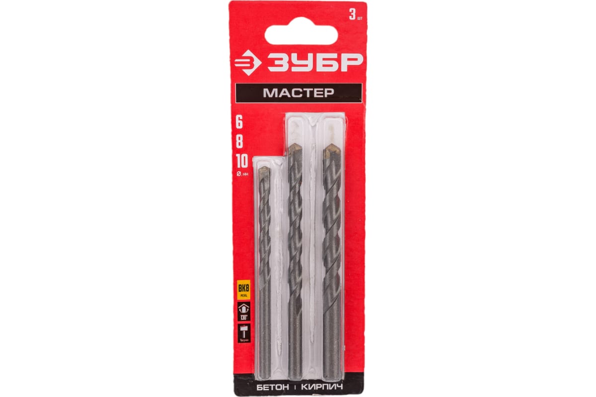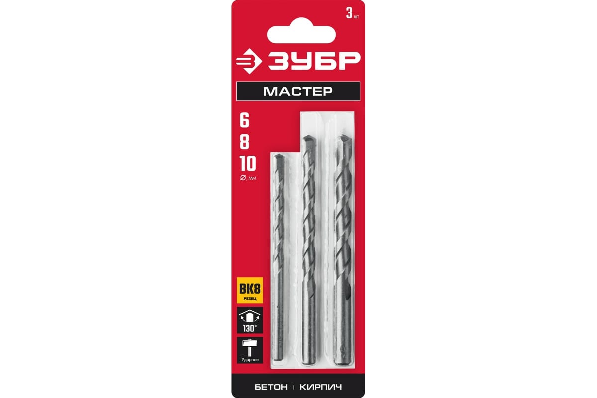 Набор сверл по бетону ЗУБР 3 шт, 6-8-10 мм 2922-H3_z01 применяется для работ по бетону, граниту, природному и искусственному камню, кирпичной кладке.