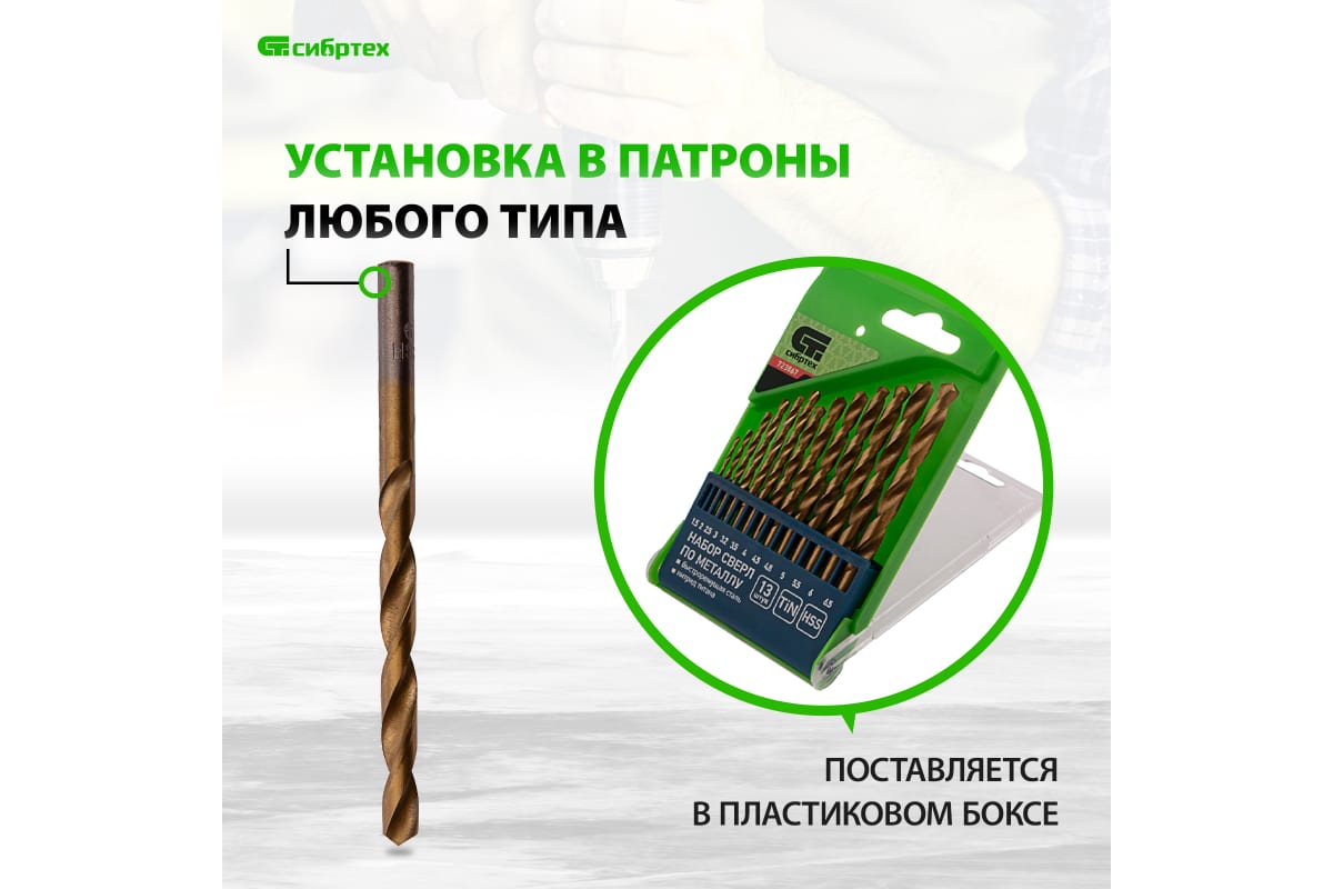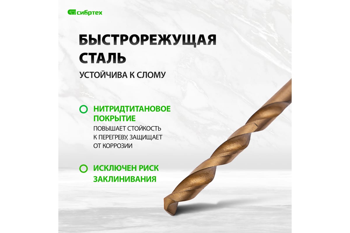 Преимущества набора нитридтитановых сверл по металлу СИБРТЕХ 723867- Оснастка изготовлена из быстрорежущей стали, поэтому устойчива к слому во время работы на высокой скорости.