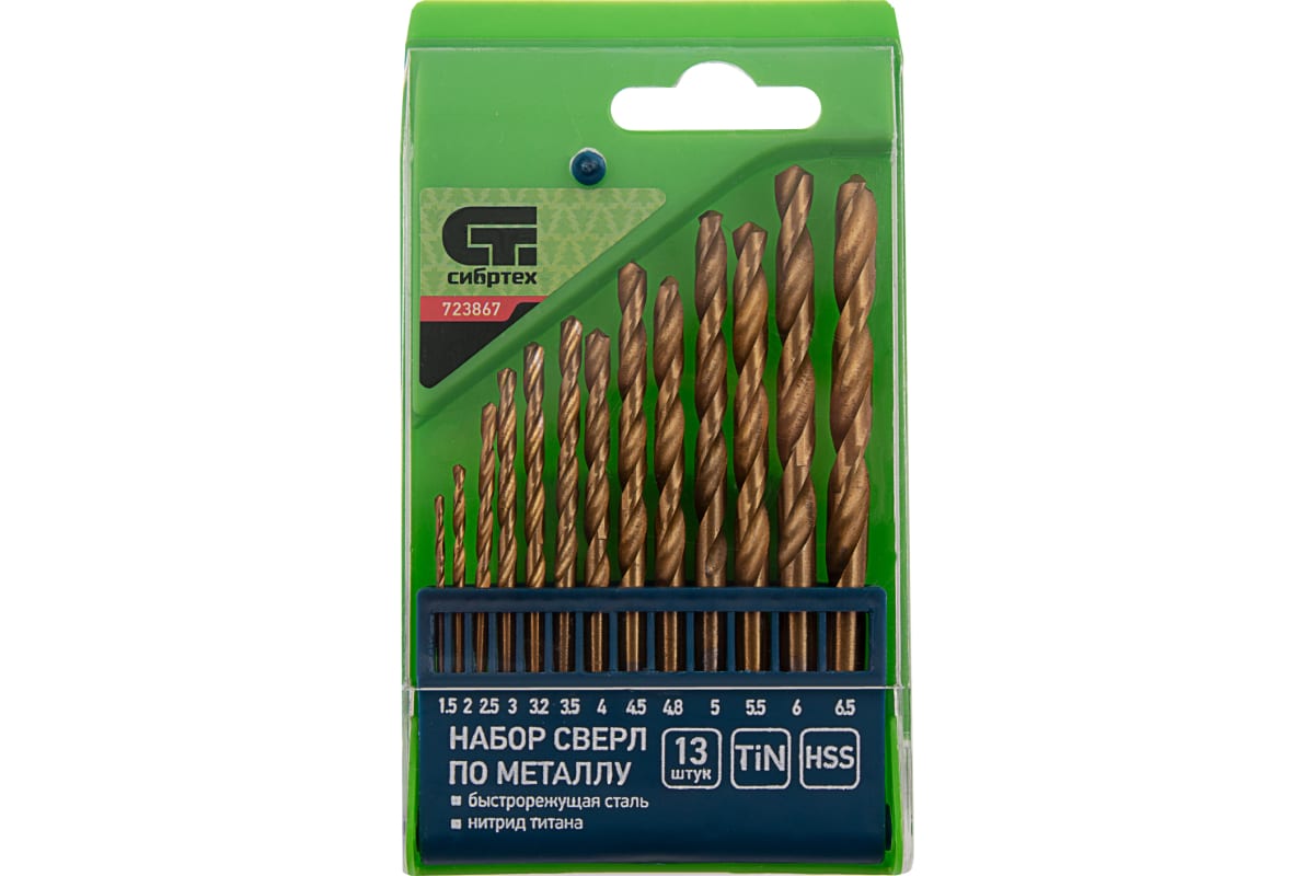 Набор сверл по металлу Сибртех 723867 с нитридтитановым покрытием, 1,5-6,5 мм (через 0,5 мм, 3,2 мм, 4,8 мм), из стали HSS, состоит из 13 шт. и предназначен для получения отверстий в заготовках из черных металлов — стали, чугуна. Включает оснастки самых востребованных размеров, будет полезен во время ремонтных работ, а также дома, на даче или в гараже.
