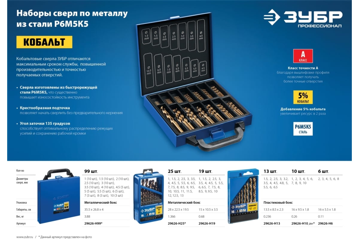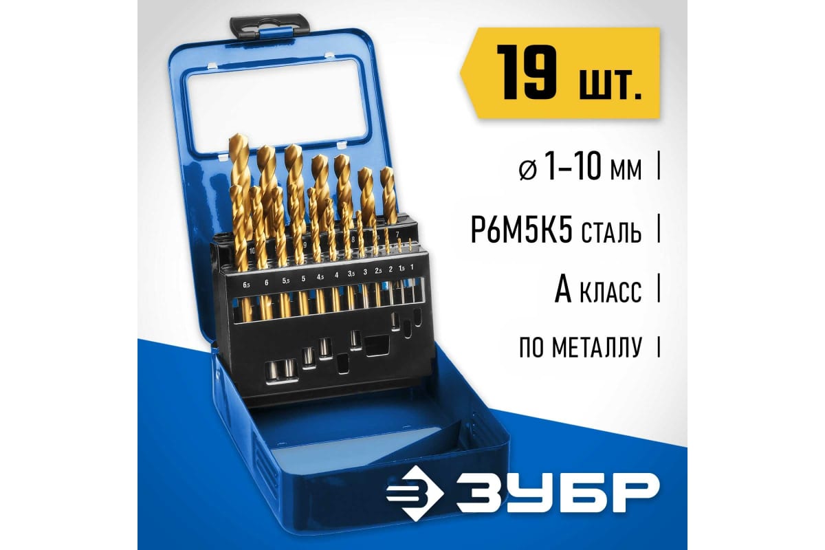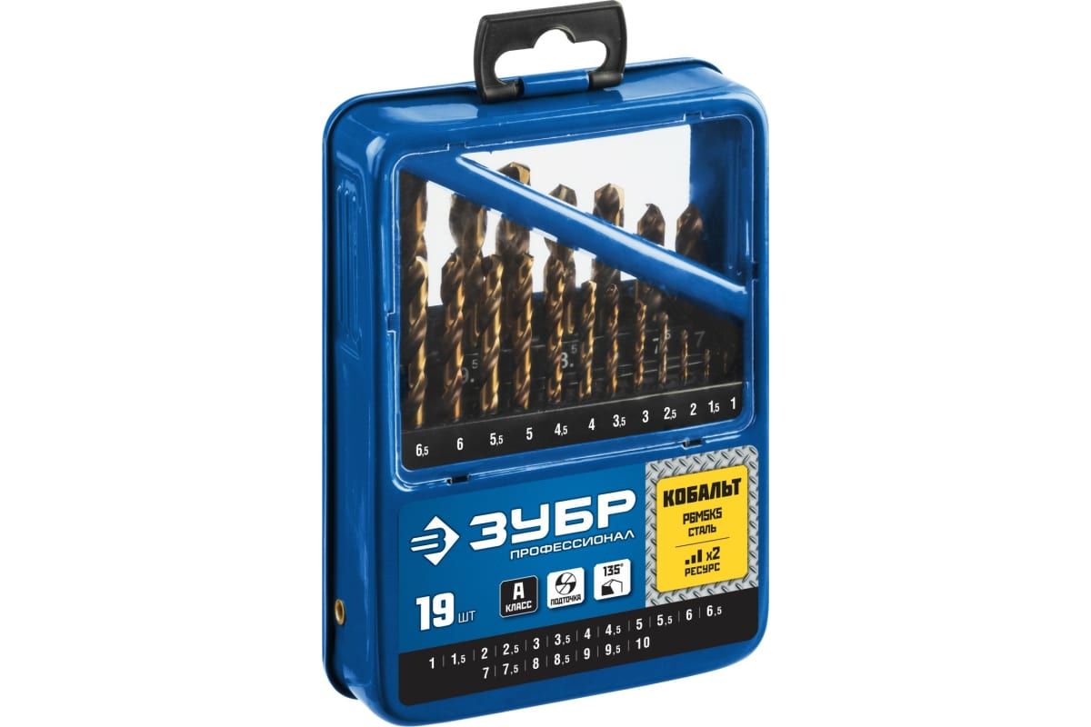 Набор сверл ЗУБР 29626-H19, предназначен для обработки легированных и углеродистых сталей с пределом прочности до 1000Н/мм2,нержавеющих и жаростойких сталей, цветных металлов, серого чугуна и пластмассы. Высококачественное, точное и производительное сверло с максимальным сроком службы. Сверло изготовлено методом шлифования профиля по ГОСТ 10902-77 и соответствует классу точности сверления "А1". Крестообразная подточка позволяет начать сверлить без предварительного кернения. Угол заточки при вершине равный 135° повышает производительность работ. Добавление кобальта значительно повышает рабочий ресурс.