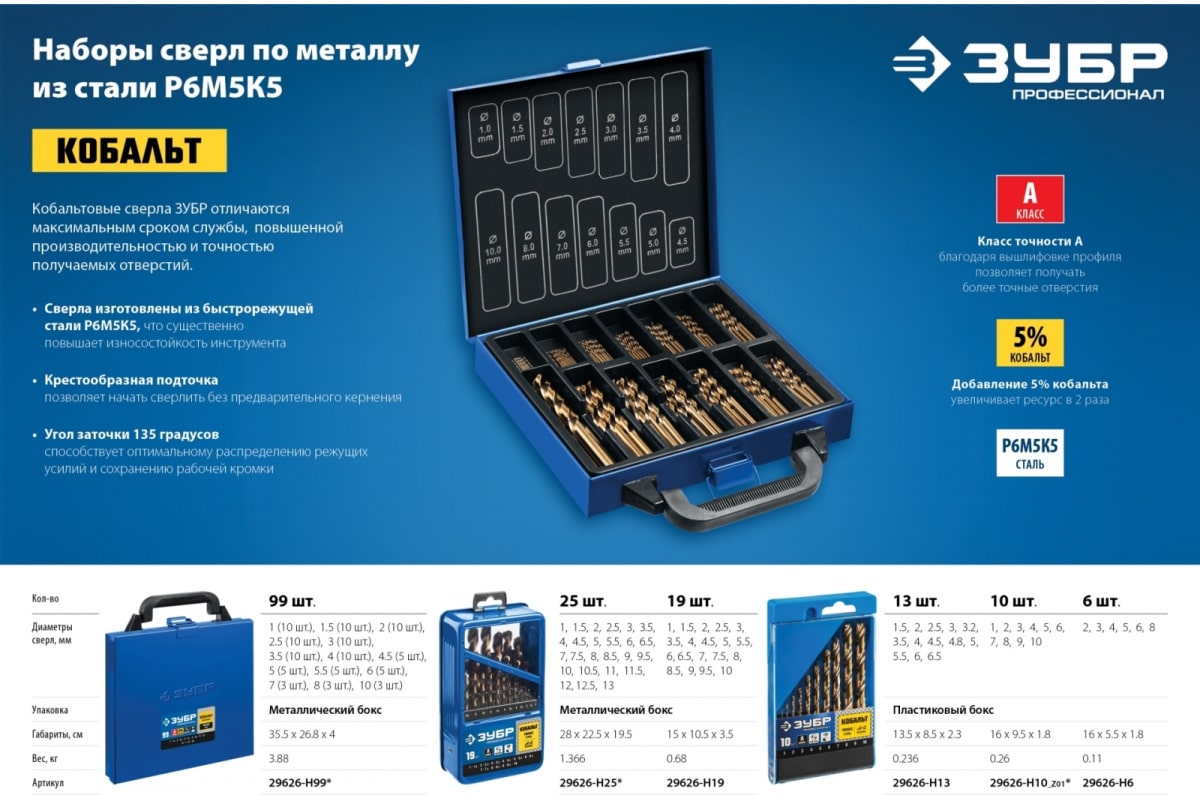 Набор сверл по металлу ЗУБР 29626-H99, предназначен для сверления металлических конструкций и заготовок. Сверло изготовлено методом шлифования профиля по ГОСТ 10902-77 и соответствует классу точности сверления "А1". Крестообразная подточка позволяет начать сверлить без предварительного кернения.