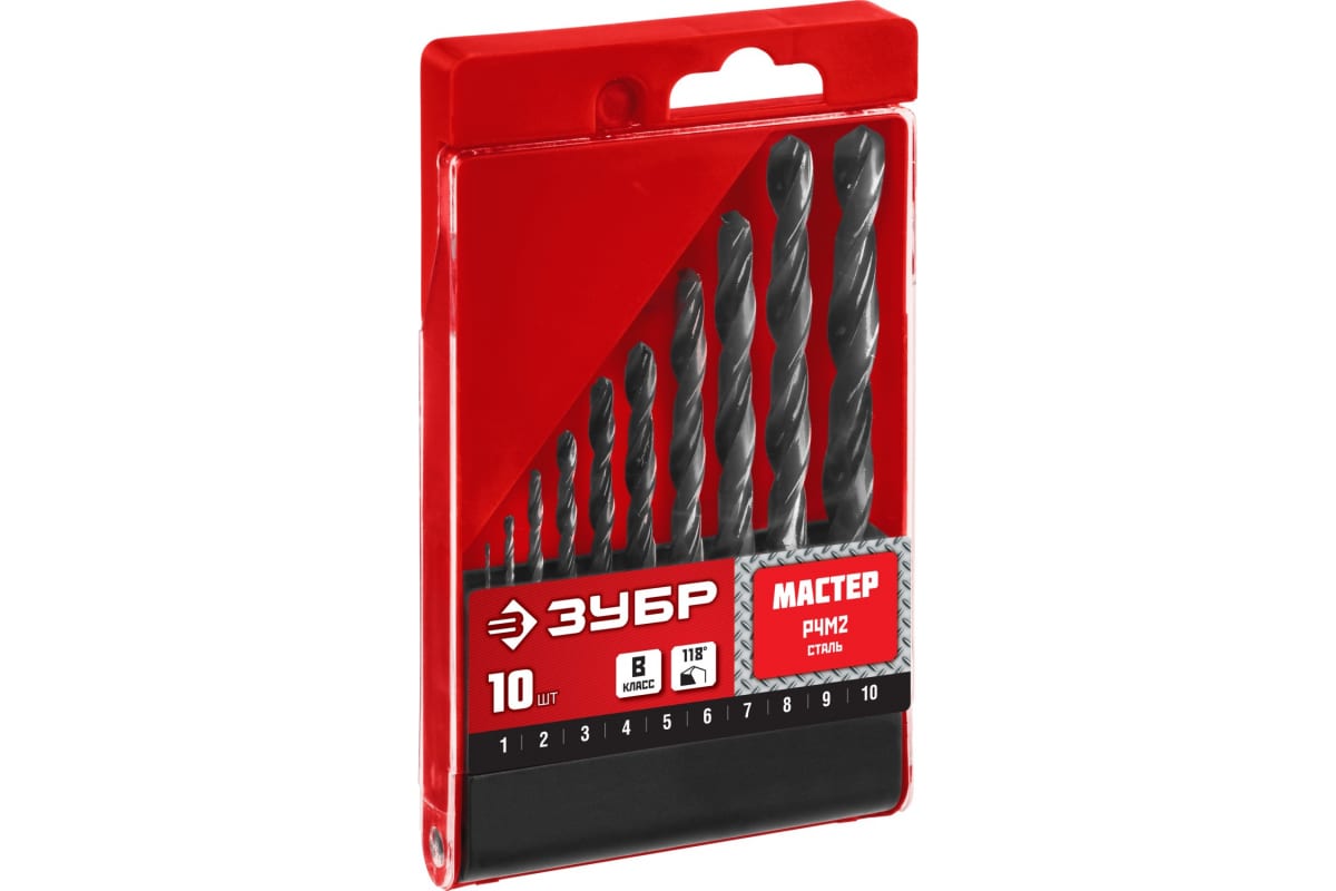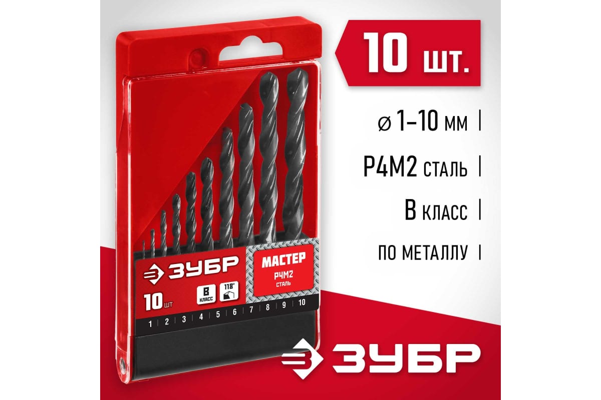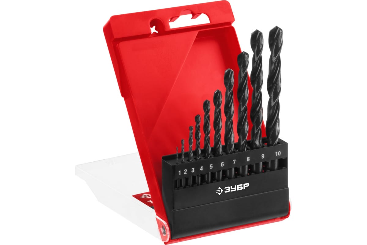 Набор сверл Зубр 29605-H10, предназначен для обработки легированных и углеродистых сталей с пределом прочности до 800Н/мм2, цветных металлов, серого чугуна и пластмассы. Универсальное сверло для большинства задач. Изготовлено методом винтового проката по ГОСТ 10902-77 и соответствует классу точности "В". Угол заточки 118 градусов позволяет обрабатывать легированные и углеродистые стали.