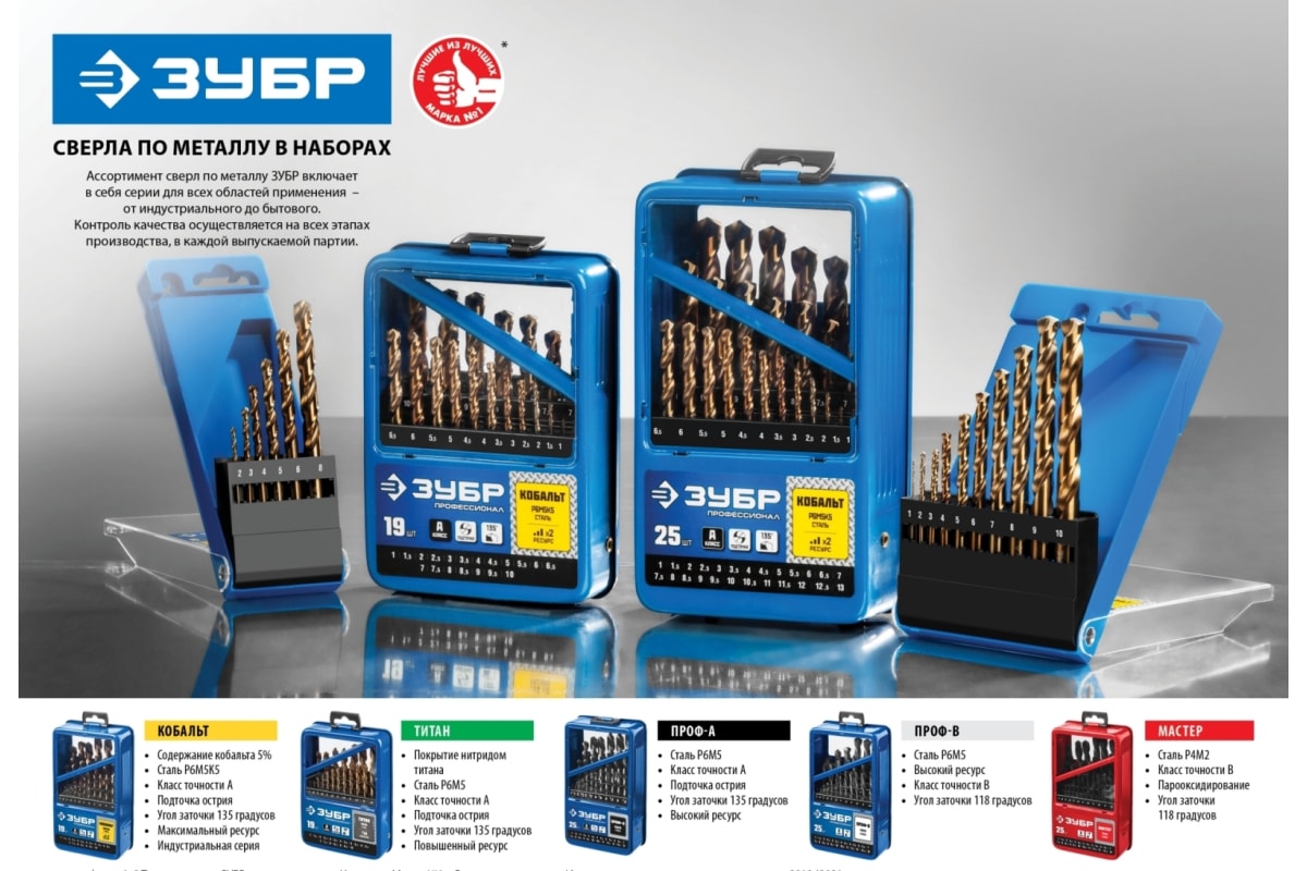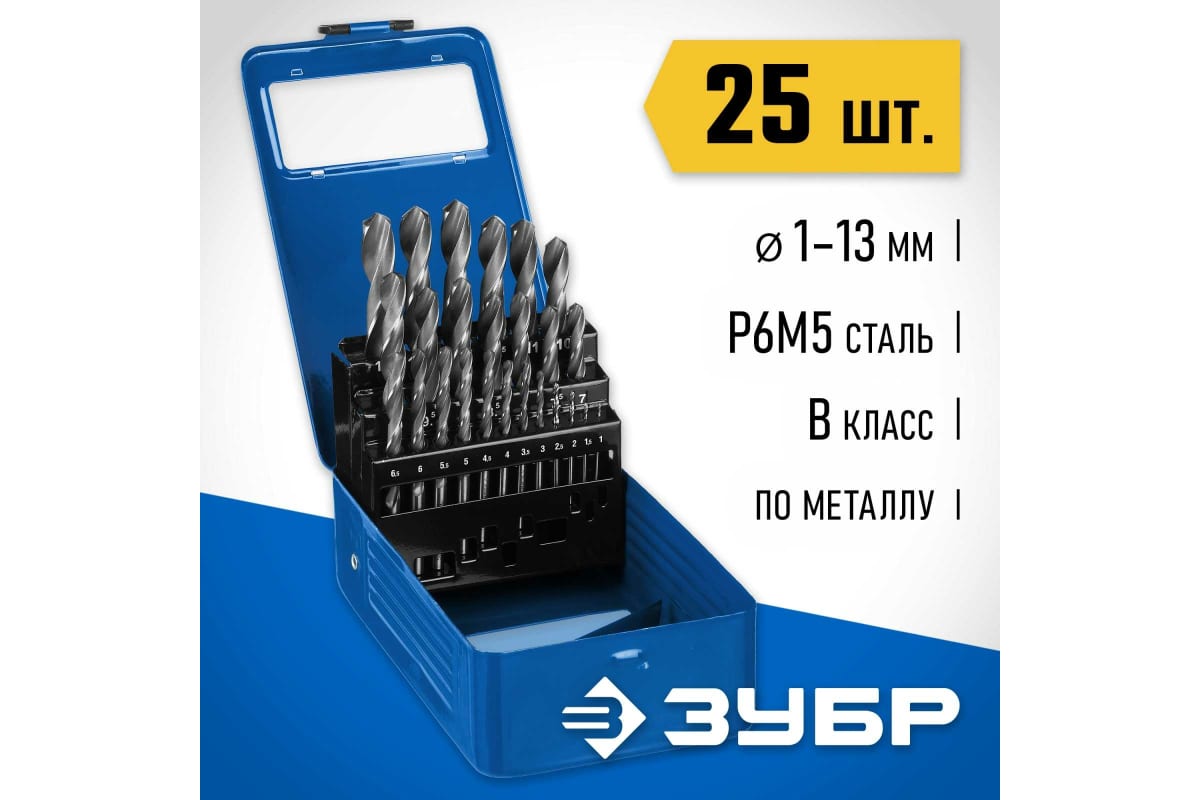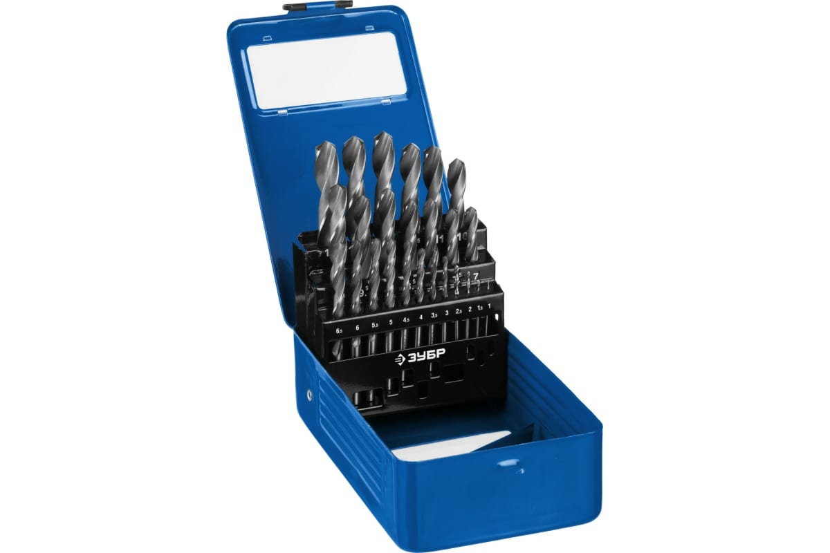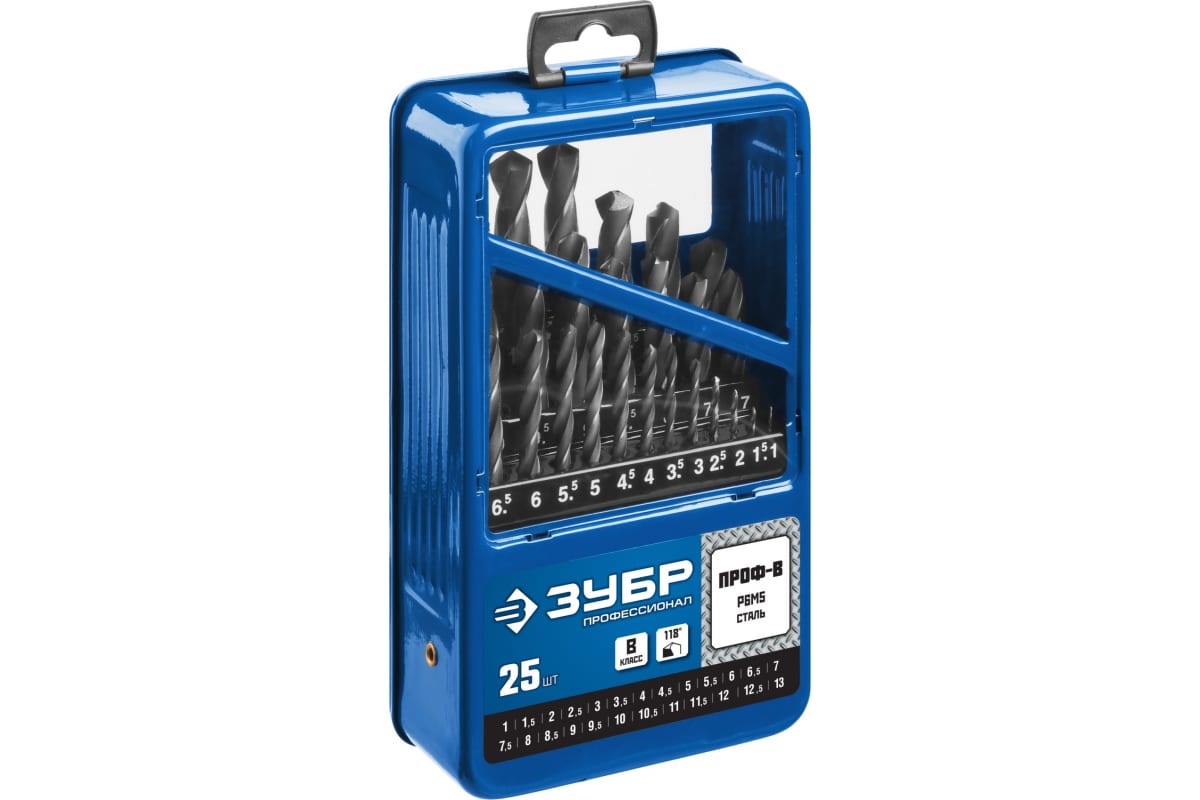 Набор сверл ЗУБР 29621-Н25, предназначено для обработки легированных и углеродистых сталей с пределом прочности до 900 Н/мм², цветных металлов, серого чугуна и пластмассы. Качественное сверло с высоким ресурсом. Изготовлено методом винтового проката по ГОСТ 10902-77 и соответствует классу точности "В". Угол заточки 118 градусов позволяет обрабатывать легированные и углеродистые стали.