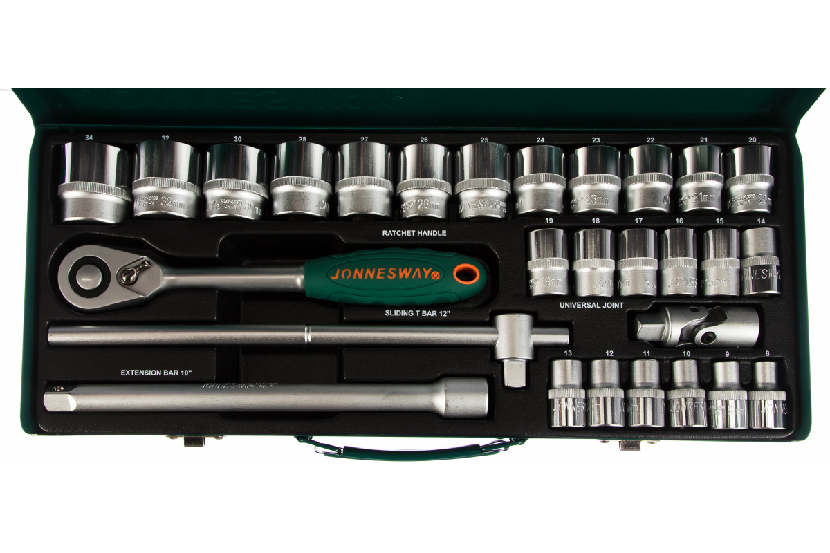 Набор торцевых головок 1/2"DR 8-34 мм Jonnesway S04H4728S состоит из двадцати восьми предметов. Для быстрого подбора инструмента, над каждой головкой написан её номер. Кейс оснащен рукояткой для удобной транспортировки.