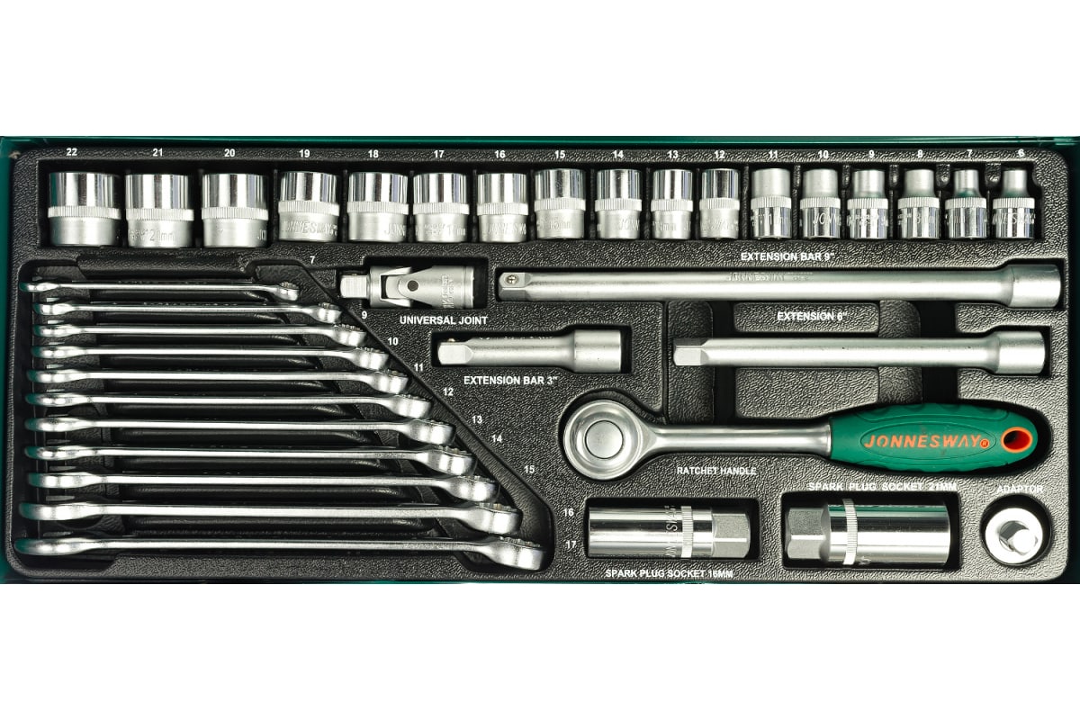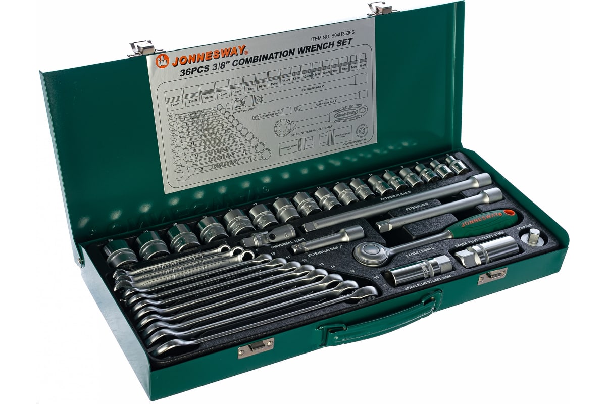 Набор торцевых головок и комбинированных ключей Jonnesway S04H3536S состоит из 36 предметов. Используется для монтажных, демонтажных, слесарных работ при производстве, ремонте автомобилей и другой техники. В комплект входят торцевые головки с размером посадочного отверстия - 3/8", приводы вращения, комбинированные ключи. Все что нужно для удобной, качественной работы с крепежом различного профиля и слабонагруженными резьбовыми соединениями.