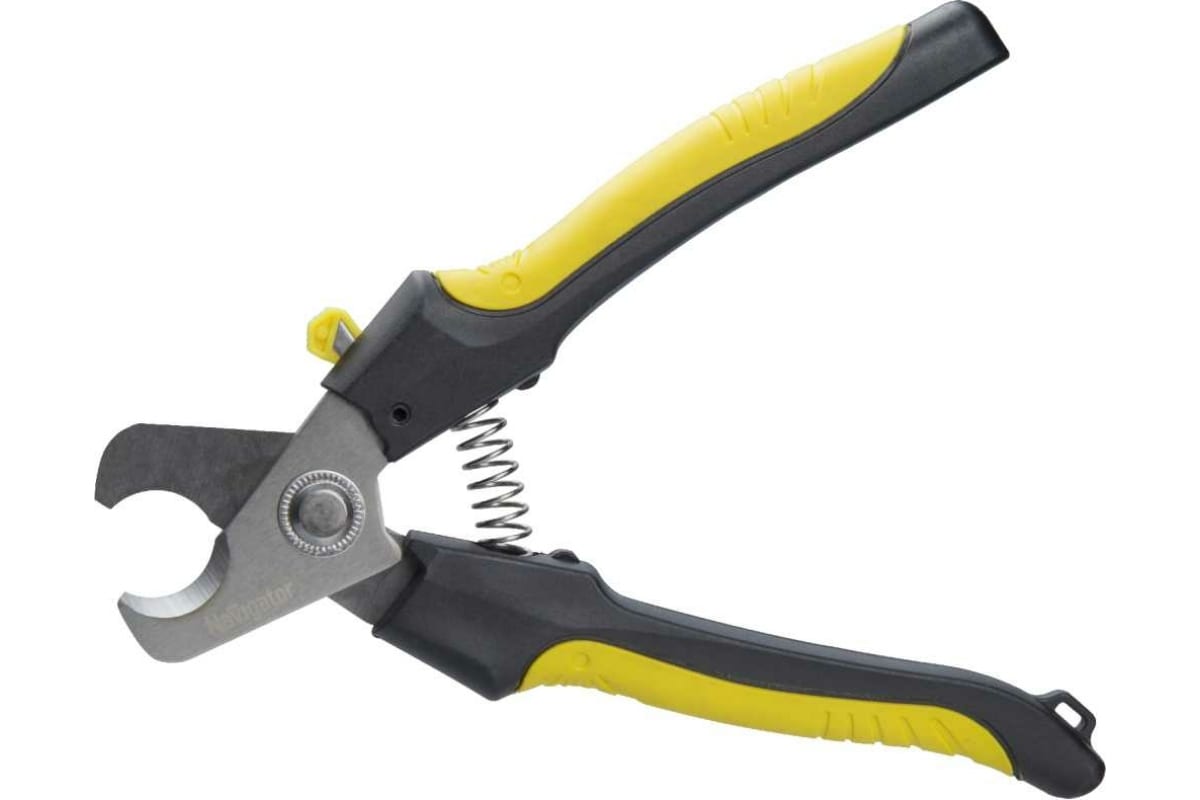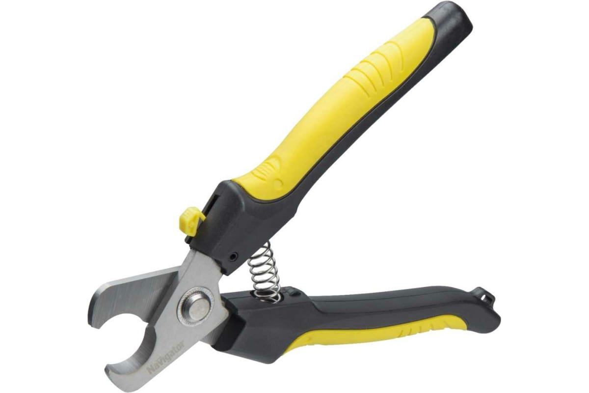 Ножницы Navigator NHT-Nk02-172 макс диаметр 10 мм, кабельные, прямые 80377 предназначены для резки медных и алюминиевых проводов, а также коаксиальных и телефонных кабелей. Упругая возвратная пружина автоматически разжимает рукоятки, что вдвое ускоряет процесс резки и позволяет прилагать значительно меньше усилий. Острые лезвия серповидной формы позволяют резать толстый многожильный кабель в одно движение. Функция блокировки рукояток защищает лезвия от потери режущих свойств при транспортировке. Лезвия изготовлены из нержавеющей стали и имеют двойную заточку, что обеспечивает длительный срок их службы. Мягкие резиновые вставки на рукоятках обеспечивают надежный хват, исключая выскальзывание.