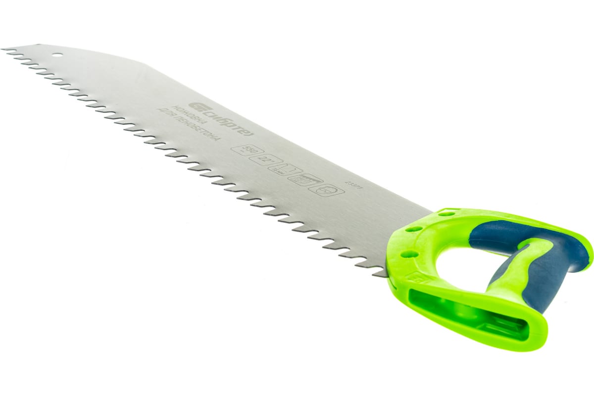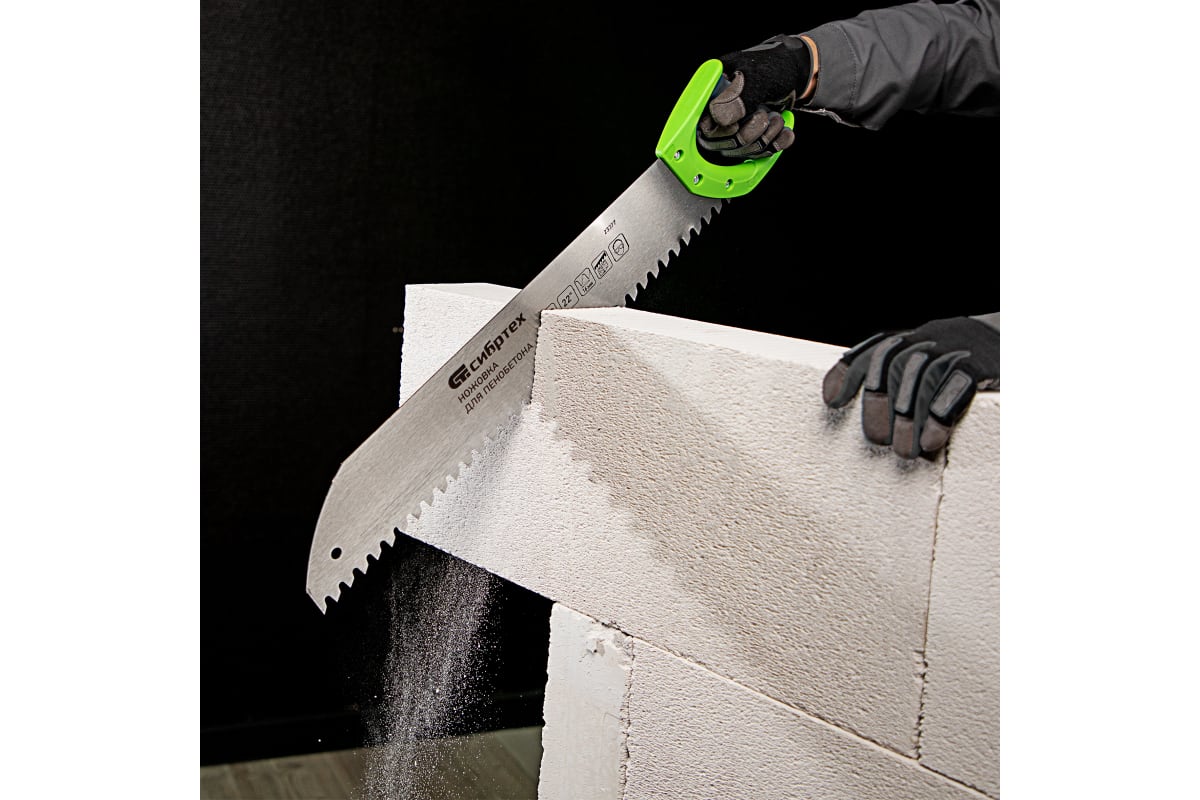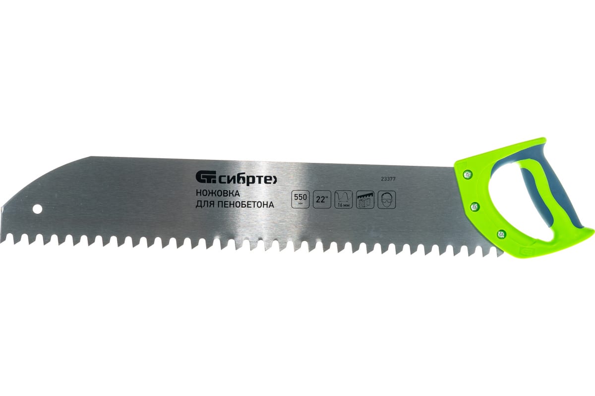 Ножовка Сибртех 23377 с полотном длиной 550 мм, с двухкомпонентной рукояткой, используется для распиливания небольших блоков из пенобетона. Высокая эффективность работы достигается благодаря крупным зубьям с шагом 16 мм и двухгранной заточкой. Ножовка применяется во время строительных работ.