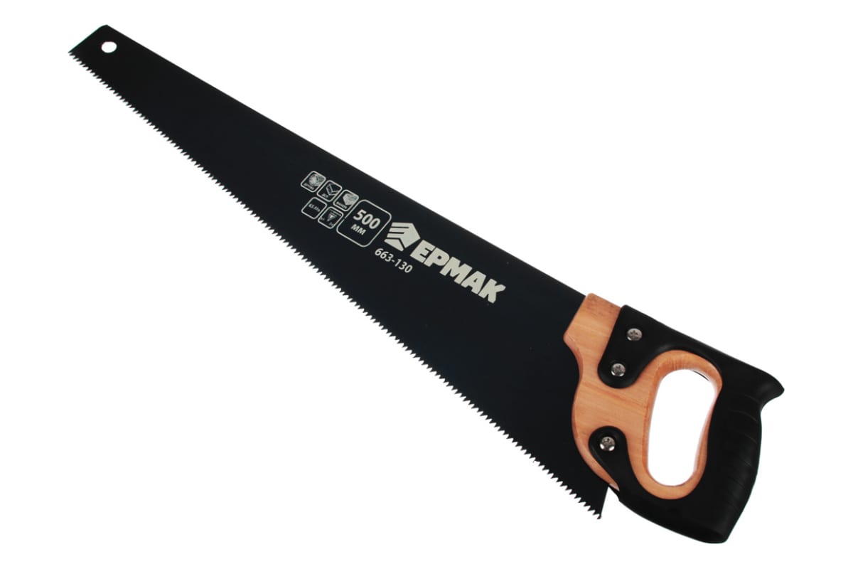 Ножовка по дереву ЕРМАК 500мм с деревянной обрезиненной ручкой, универсальный зуб, 4 мм 663-130 предназначена для распиливания сухой древесины. Вся поверхность режущей части закалена для повышения твердости зубьев, что увеличивает срок службы устройства.