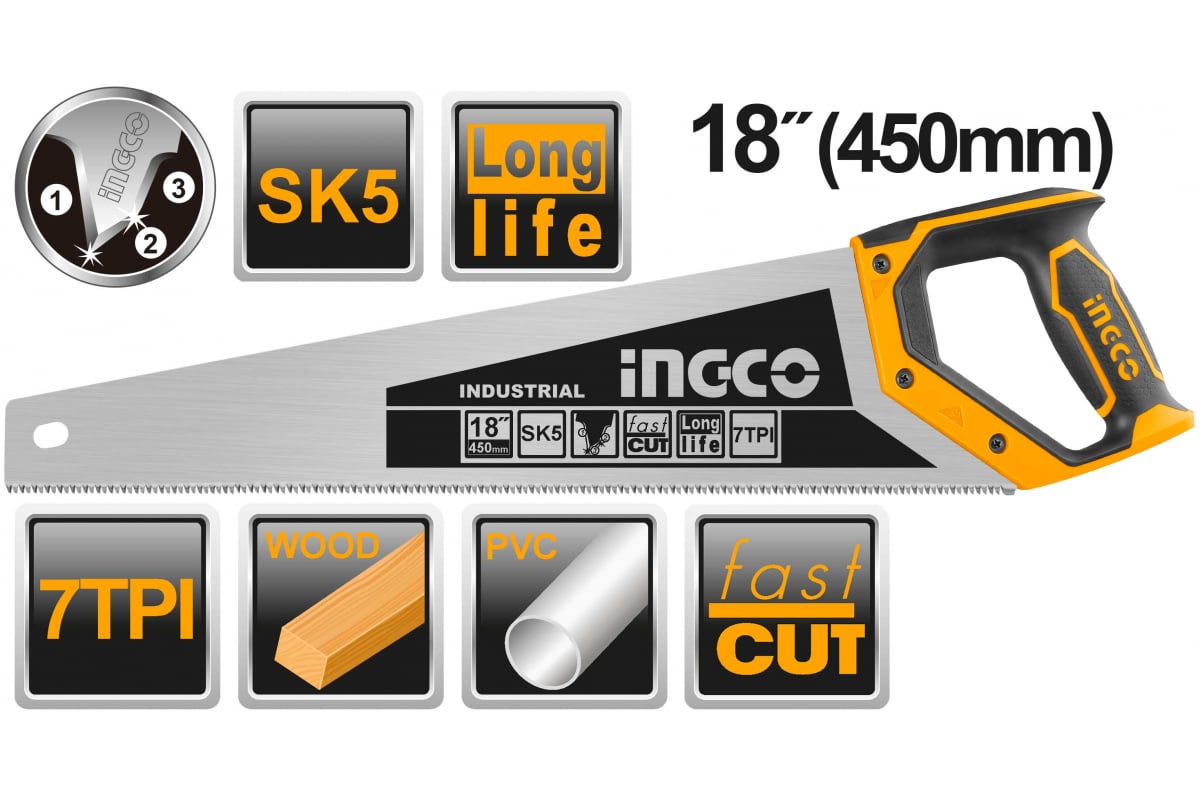 Ножовка по дереву INGCO INDUSTRIAL 450 мм HHAS28450 используется для распила изделий из древесины. Пильное полотно выполнено из углеродистой стали марки SK5, которая известна благодаря своей прочности и хорошо держит заточку. Тройная заточка зубьев обеспечивает качественный рез заготовки.