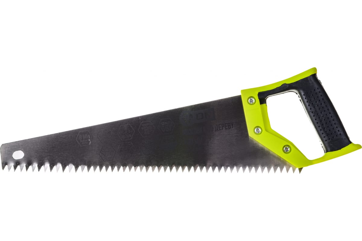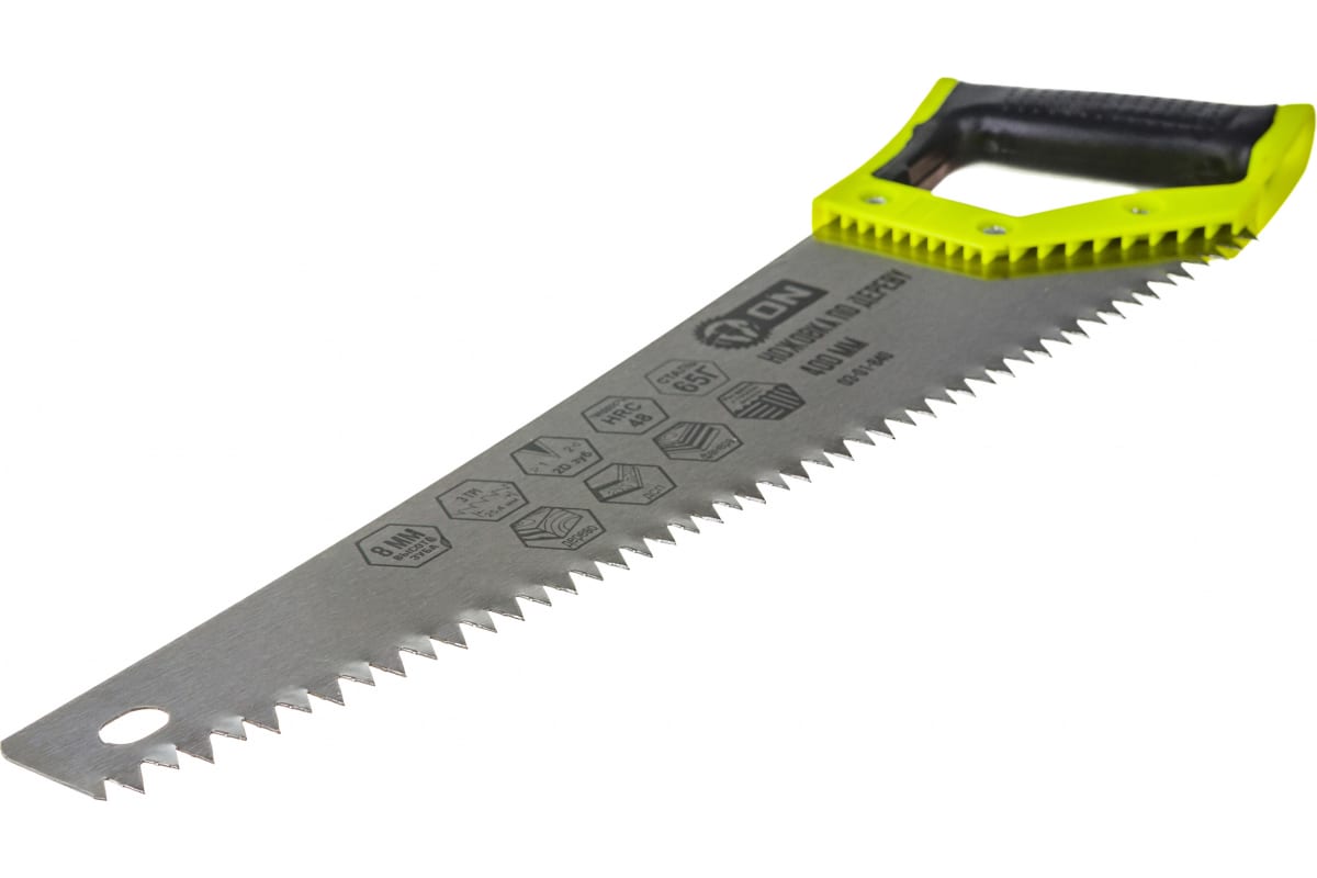 Ножовка по дереву ON 2-х сторонняя заточка, зуб 8 мм, 450 мм 03-01-845 имеет двухкомпонентную эргономичную рукоятку. Полотно изготовлено из углеродистой стали 65Г. Универсальный разведенный зуб высотой 8 мм с двусторонней заточкой, твердостью HRC 48. Предназначена для быстрого и точного распила любых заготовок вдоль и поперек волокон.