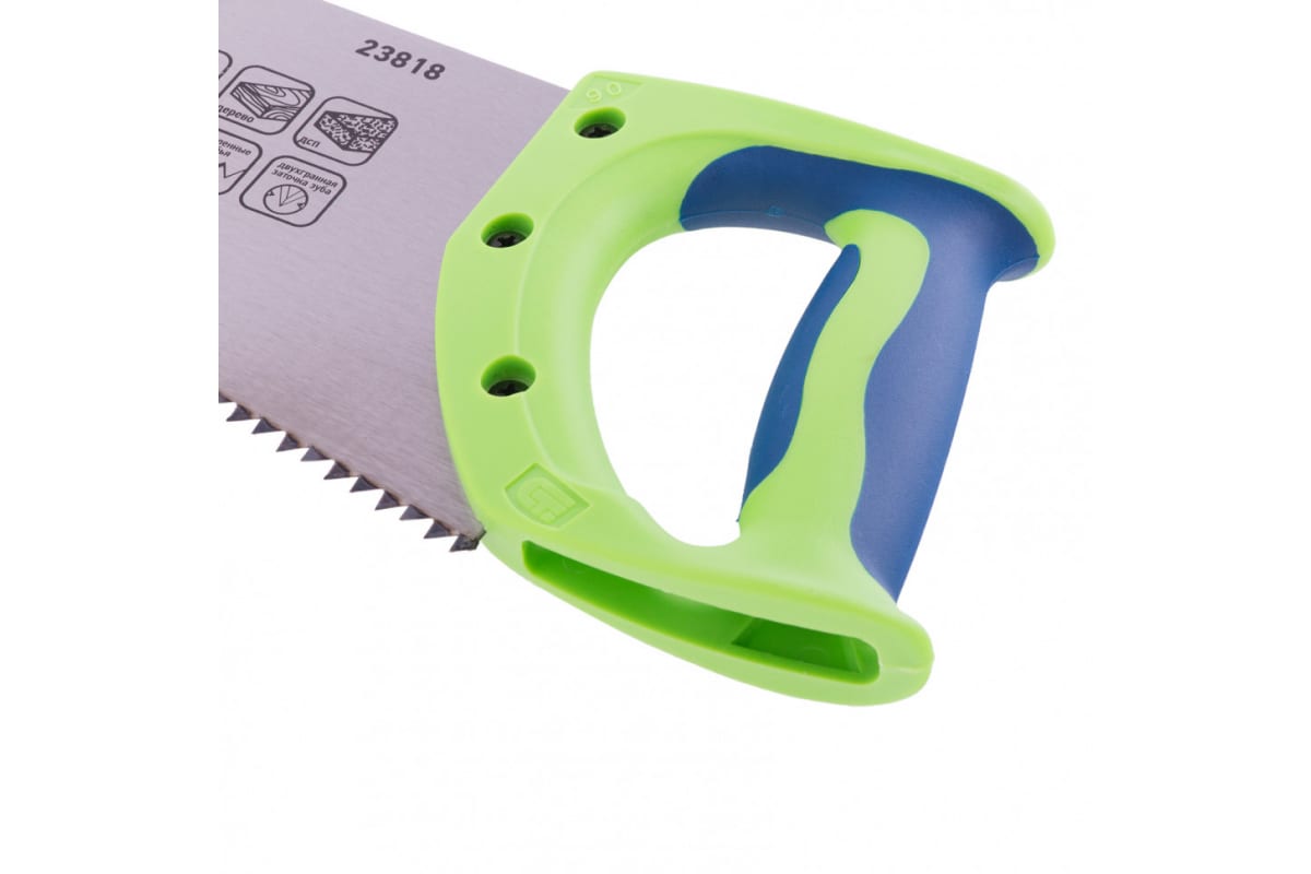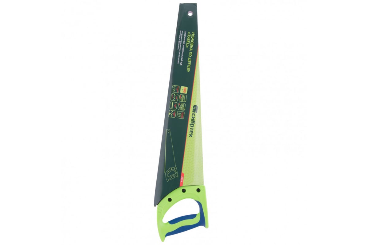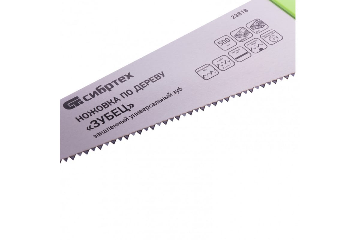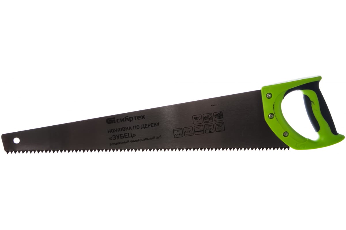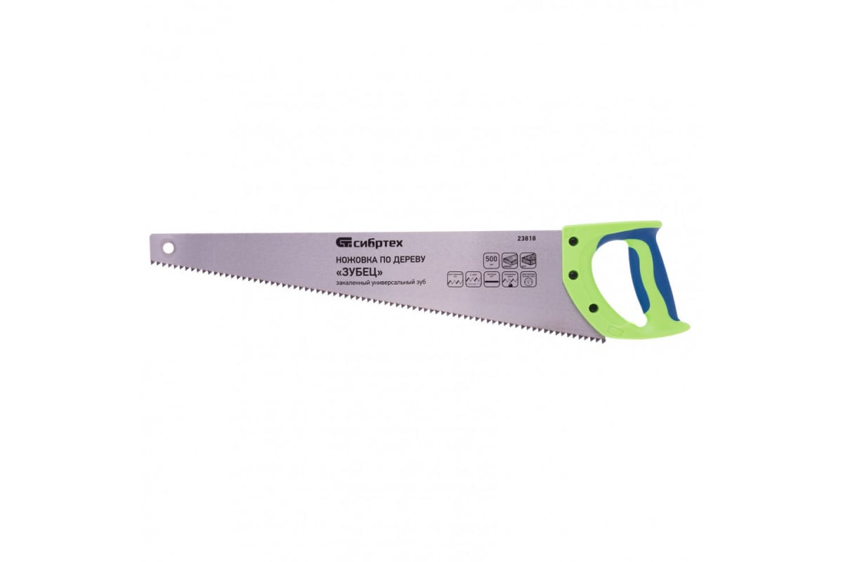 Ножовка по дереву Сибртех «Зубец» 23818 с полотном длиной 500 м, калеными зубьями с шагом 6,5 мм и 2D-заточкой, 2-компонентной рукояткой, используется для продольного и поперечного пиления древесины и ДСП. Рабочая кромка с 4 зубьями на дюйм обеспечивает быстрый рез. Зубья имеют 2D-заточку, благодаря чему ножовкой можно пилить в направлении как от себя, так и на себя. Возможна заточка режущей части. Ножовка применяется для выполнения плотницких работ, пригодится также и в быту.