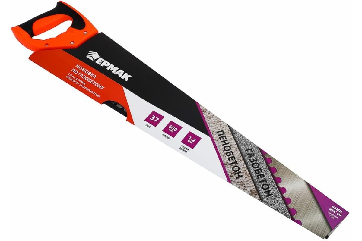 Ножовка по газобетону ЕРМАК 650 мм 663-137 оснащена длиной полотна 650 мм и толщиной полотна 1,2 мм с 37 зубьями. Модель предназначена для распила газобетона и пенобетона. Выполнена из закаленной стали 65 MN HRC 50, благодаря чему имеет оптимальную твердость и запас прочности, что обеспечивает качественный и быстрый рез. Надежная рукоятка оснащена антискользящей накладкой для комфортного хвата.