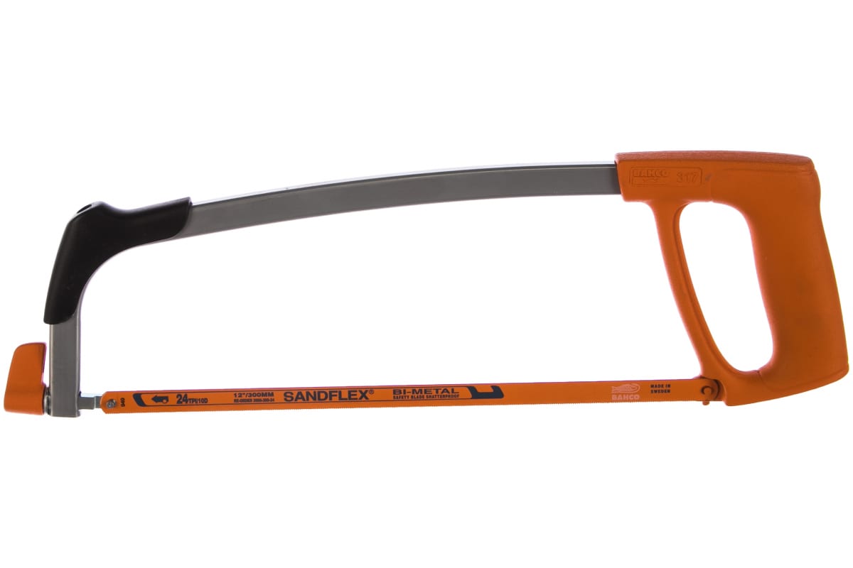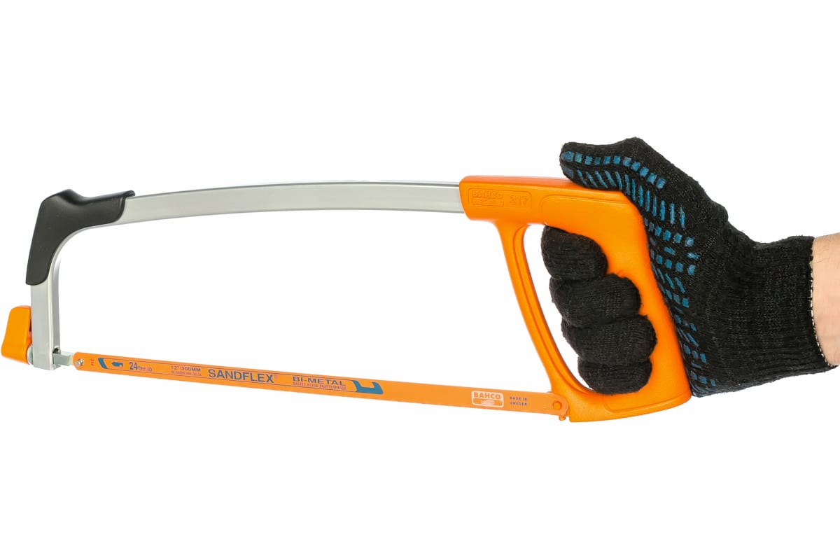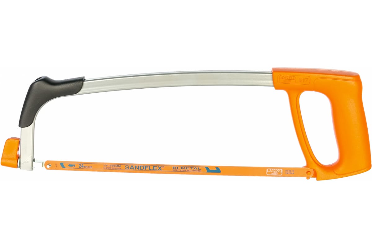Ножовка по металлу BAHCO 317 обладает малым весом и удобной ручкой, благодаря чему работать легче. Инструмент можно использовать в труднодоступных местах. Высокопрочное полотно Sandflex с шагом 24 зуба на дюйм повышает режущие способности, позволяя распилить практически любую металлическую заготовку. Допускается установка полотна под углом 90°. Длина полотна 300 мм. Длина ножовки 432 мм.